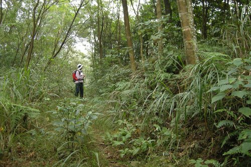 11/22周日恰逢晴朗的天候,抽空就先由台三線關西鎮的竹25鄉道進入,途中先到顯伯公風景區、找到最快速路線三登雞寮坑山﹝三次都走不同路線、算是三路會師了﹞。之後開車續行竹25鄉道,在約5.1K里程處左側叉路前空地停車,南何山登山口則在前方約6.2K里程處。啟步進入土路後先下行,約5~6分鐘後抵達右側一大片菜園開墾地,菜園前方則有座小山頭,即是十六分山基石所在。往前方山徑續行一小段路,路右有不明顯上切痕跡,找前方落差較小處取刀上切,循著山人、山水雲前輩幾片嶄新路條上切,不一會即跟著路條來到高點,右下方即剛才那片菜園。可是一家四口八隻眼睛,在新路條沿線有路跡處的小塊山頭雜草堆中找了好一會,就是找不到基石的任何蛛絲馬跡,也沒看到山水雲前輩熟悉的山頂標示牌,一切顯得如此不尋常。翻了一陣子後,猜想可能總督府圖根補點本來就不存在或早已遺失,所以前輩才會未釘上山頂標示牌、而且也沒有很明顯找到基石的跡象,因此便準備原路下切。此時小朋友卻在山頂看到一條具有巧妙保護色的小蛇往左前方竄爬,為了觀察這條小蛇,因此暫時留下了我們在山頂的腳步。