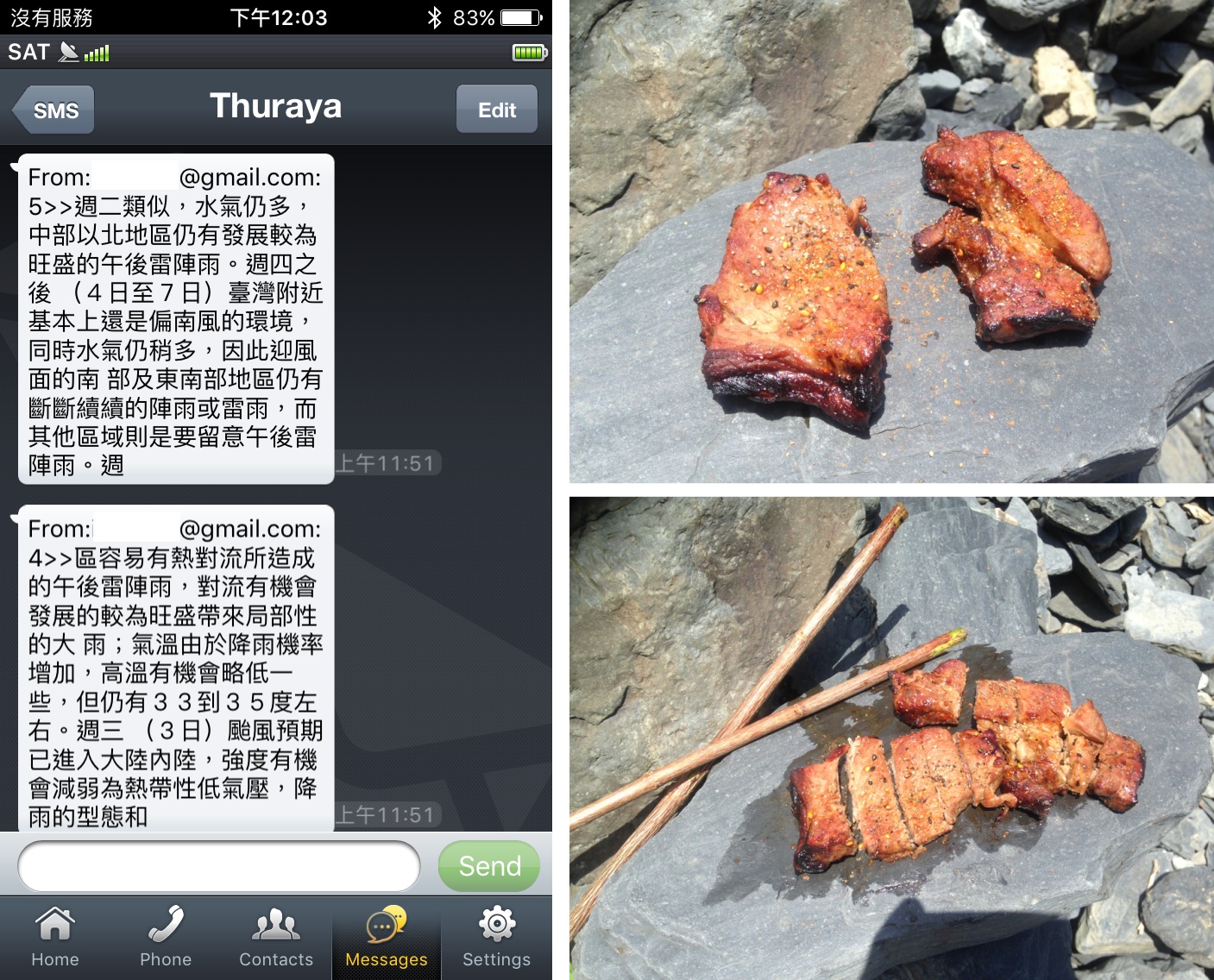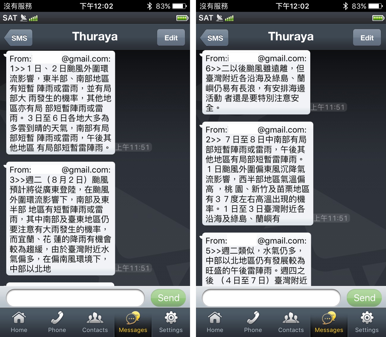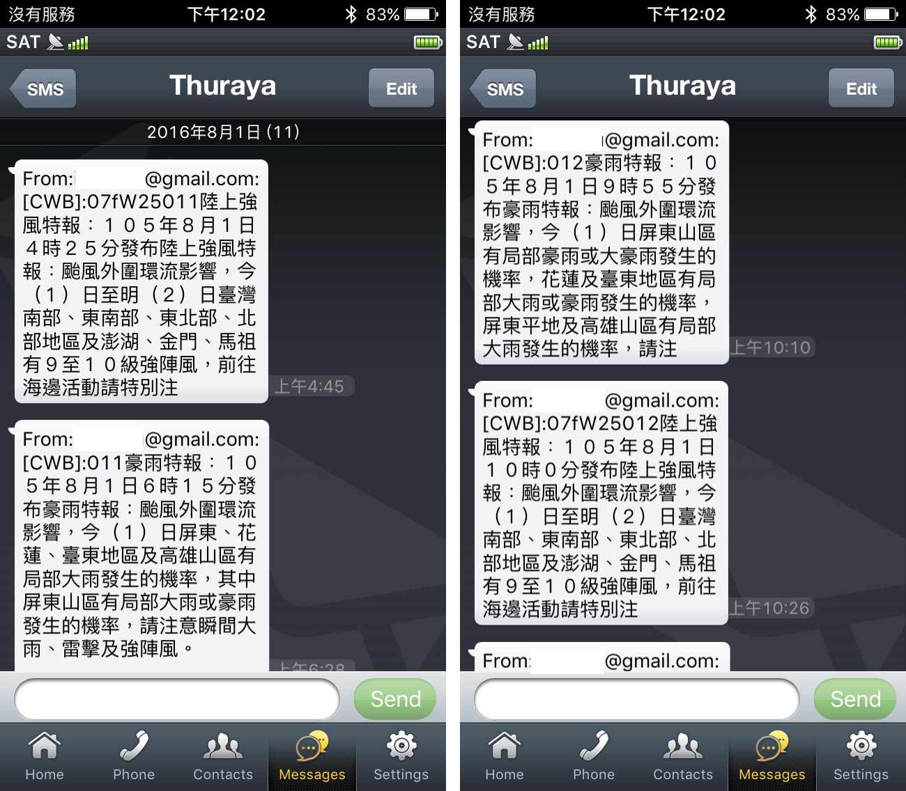 今天山中天氣也是十多變,收收衛星簡訊,其中特報個人覺得還蠻具即時參考價值,未來有空再整合到衛星電話登山天氣預報警報回傳系統中。