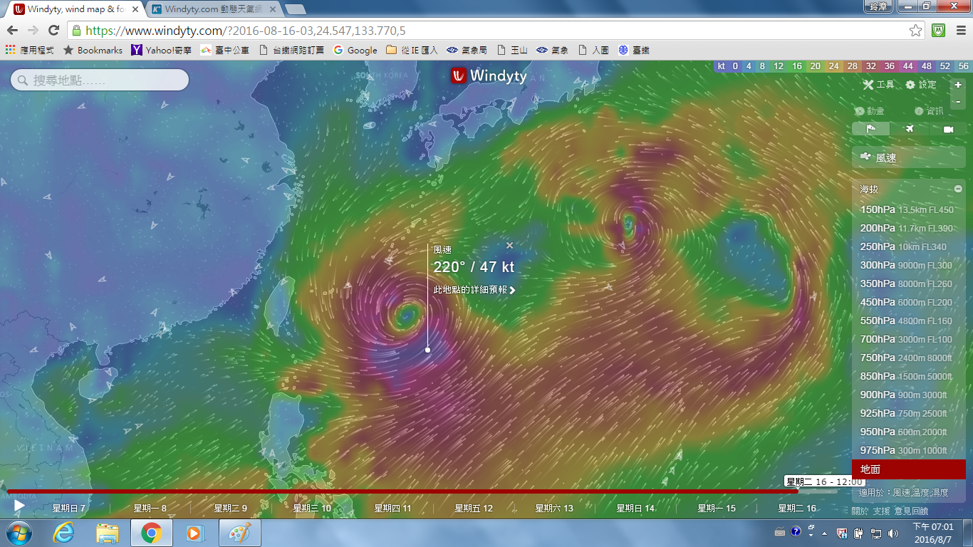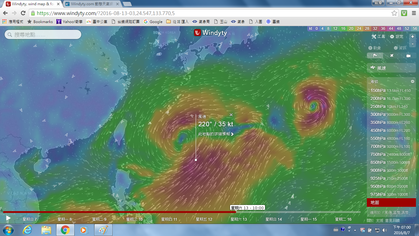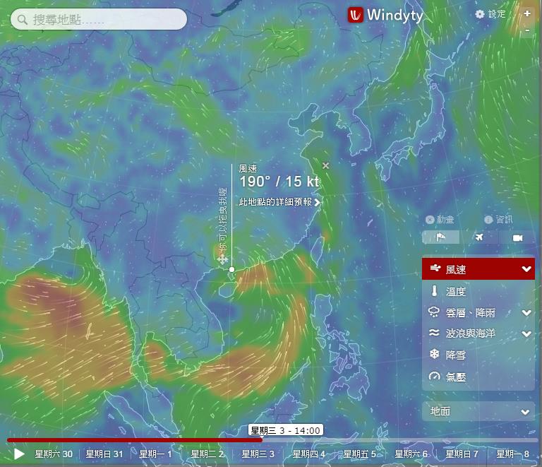 Windyty.com 是一個動態天氣的網站,可預測 12 天的氣象資料,當然時間越遠,誤差就會越大。但上次 7/8 襲台的尼伯特颱風,該站在 6/30 就計算出會形成颱風並且侵台,當時美國海軍氣象台都說西北太平洋無任何低壓擾動形成呢!