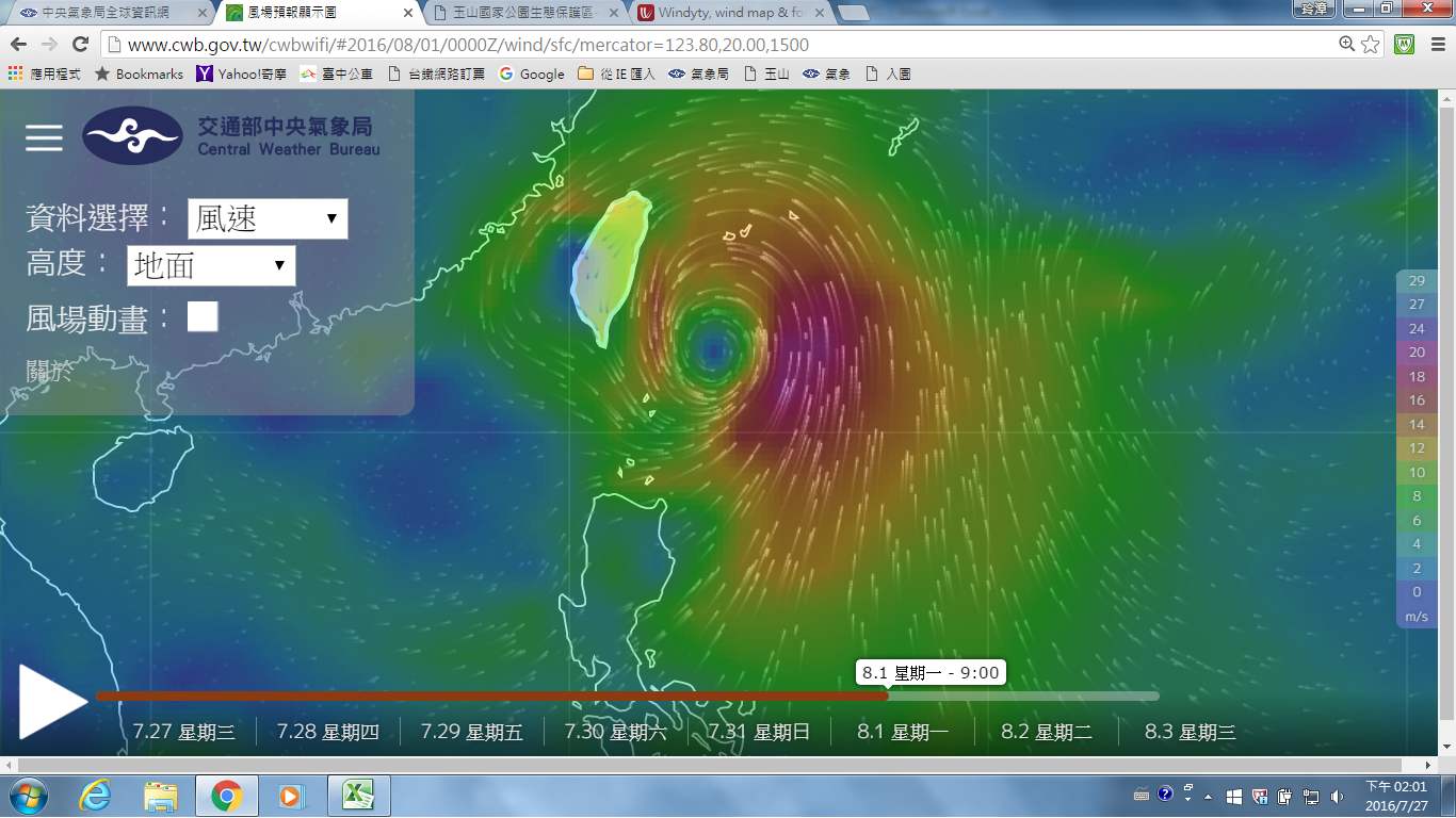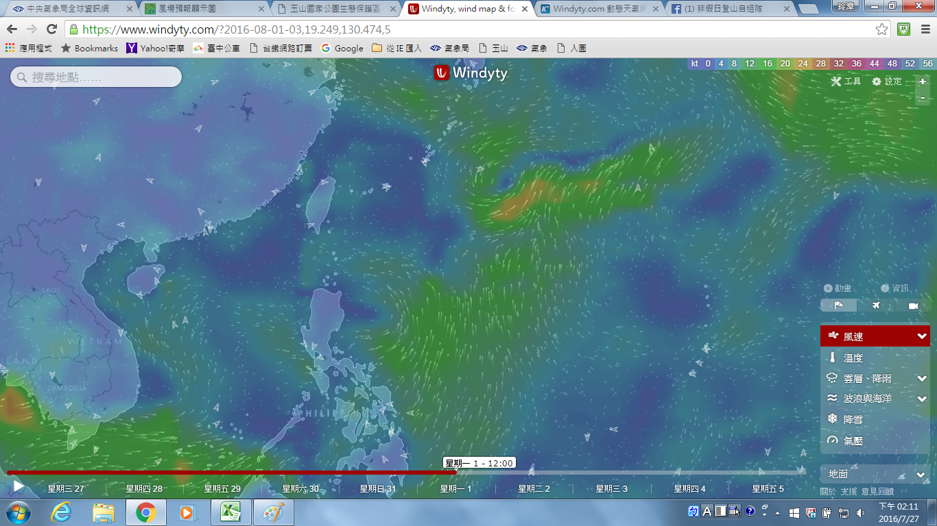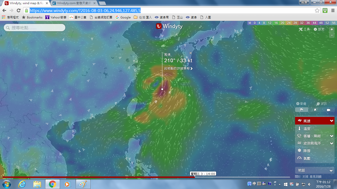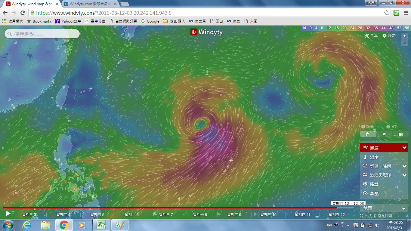 windyty 還模擬出 8/3 颱風,在台灣和日本之間行進緩慢,西南氣流很可能為西南部帶來不少雨量。颱風或低壓在那個位置停滯,夏天常常會引進西南氣流,八七水災就是這樣引起的大災難。