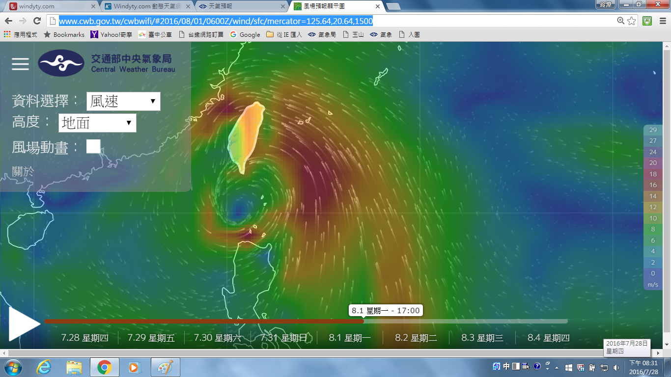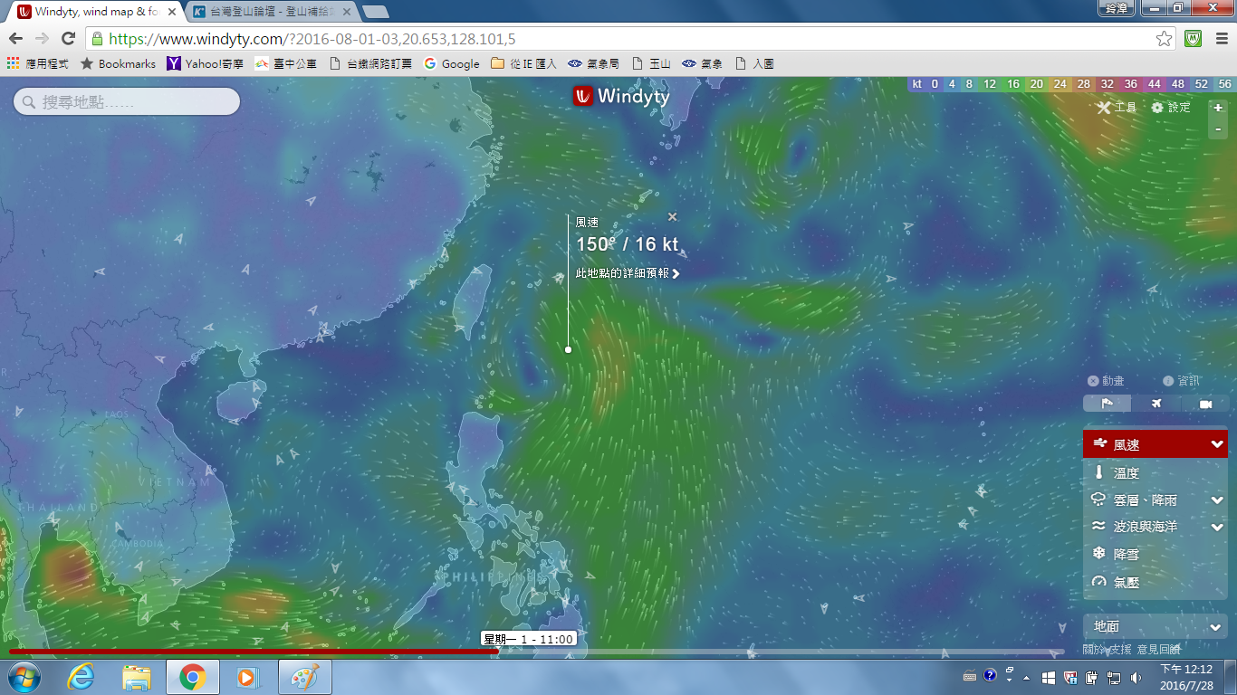 7/28 windyty.com 對下週一的氣流模擬如圖,可能介於熱帶低壓和輕度颱風之間(從動畫可以看出,幸好有其他低壓分散了氣流,減低它的威力)