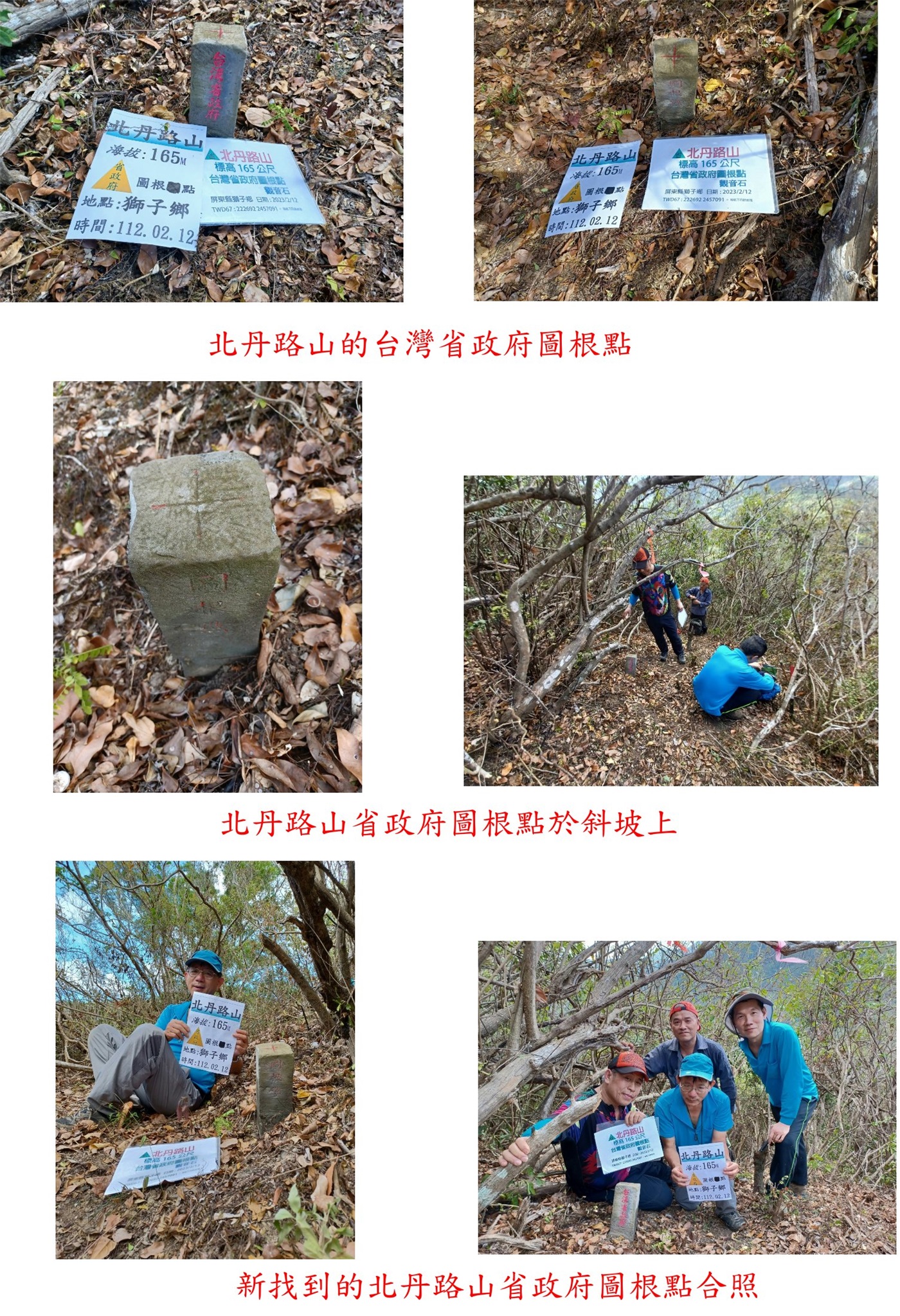 2、北丹路山:位於屏東縣獅子鄉,標高217公尺,台灣省政府圖根點;座標222687 2457105。