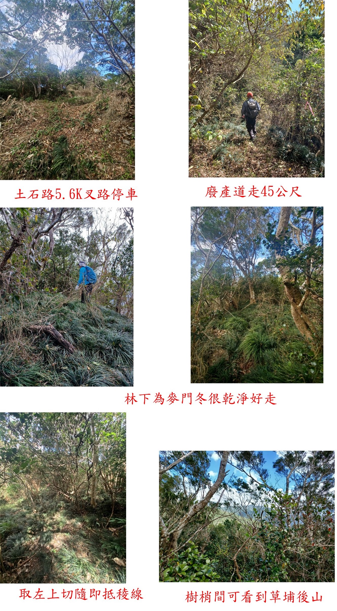 取右廢產道走45公尺,取左上切隨即抵稜線,林下為麥門冬很乾淨,走6分鐘抵達東巴士墨山台灣省政府圖根補點;此點係7777山友剛找到不久,基石於稜尾肩狀稜小山頭,展望欠佳,北面樹梢間可看到草埔後山;拍照後原路回,此點往返費時23分鐘。