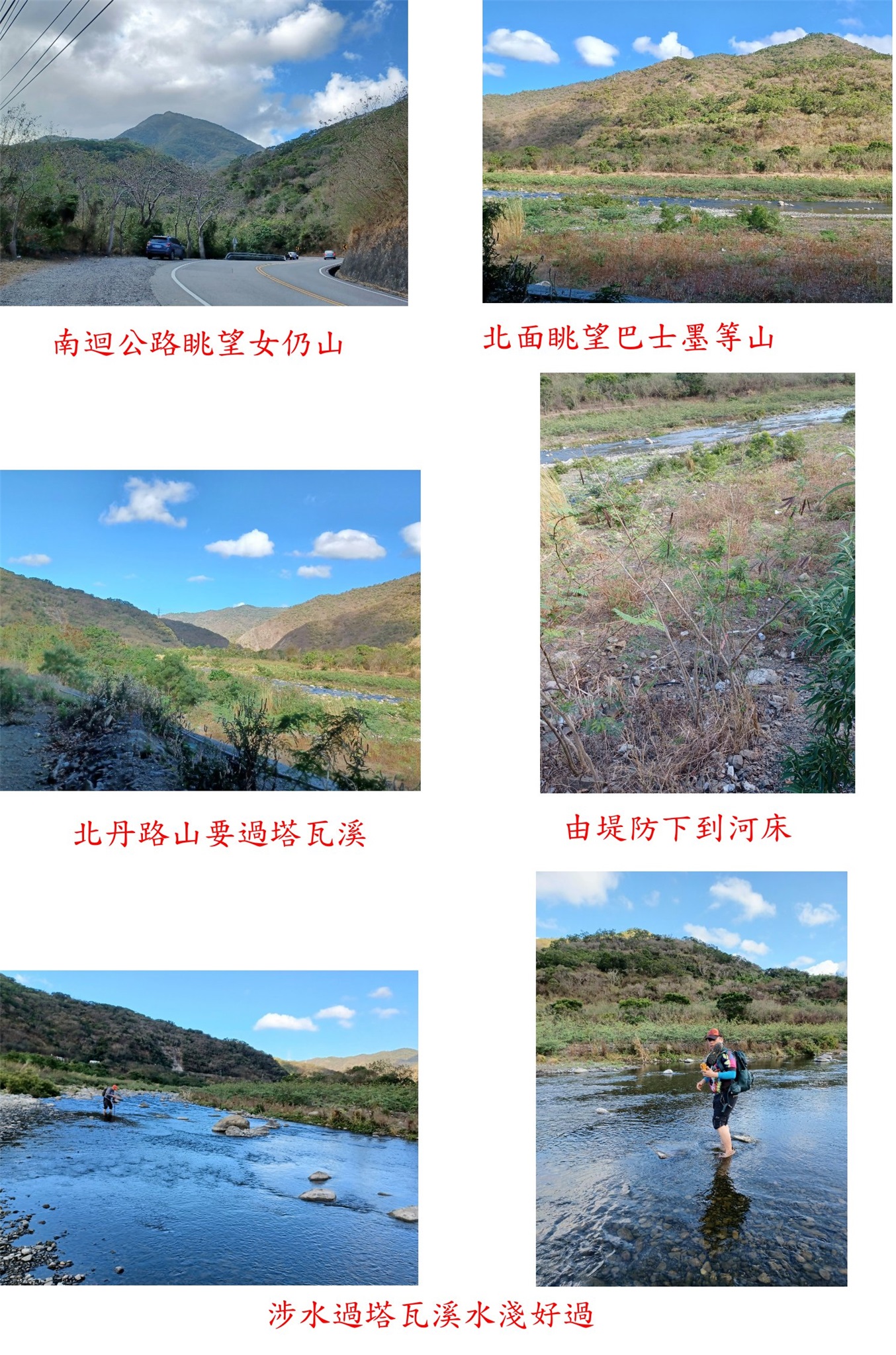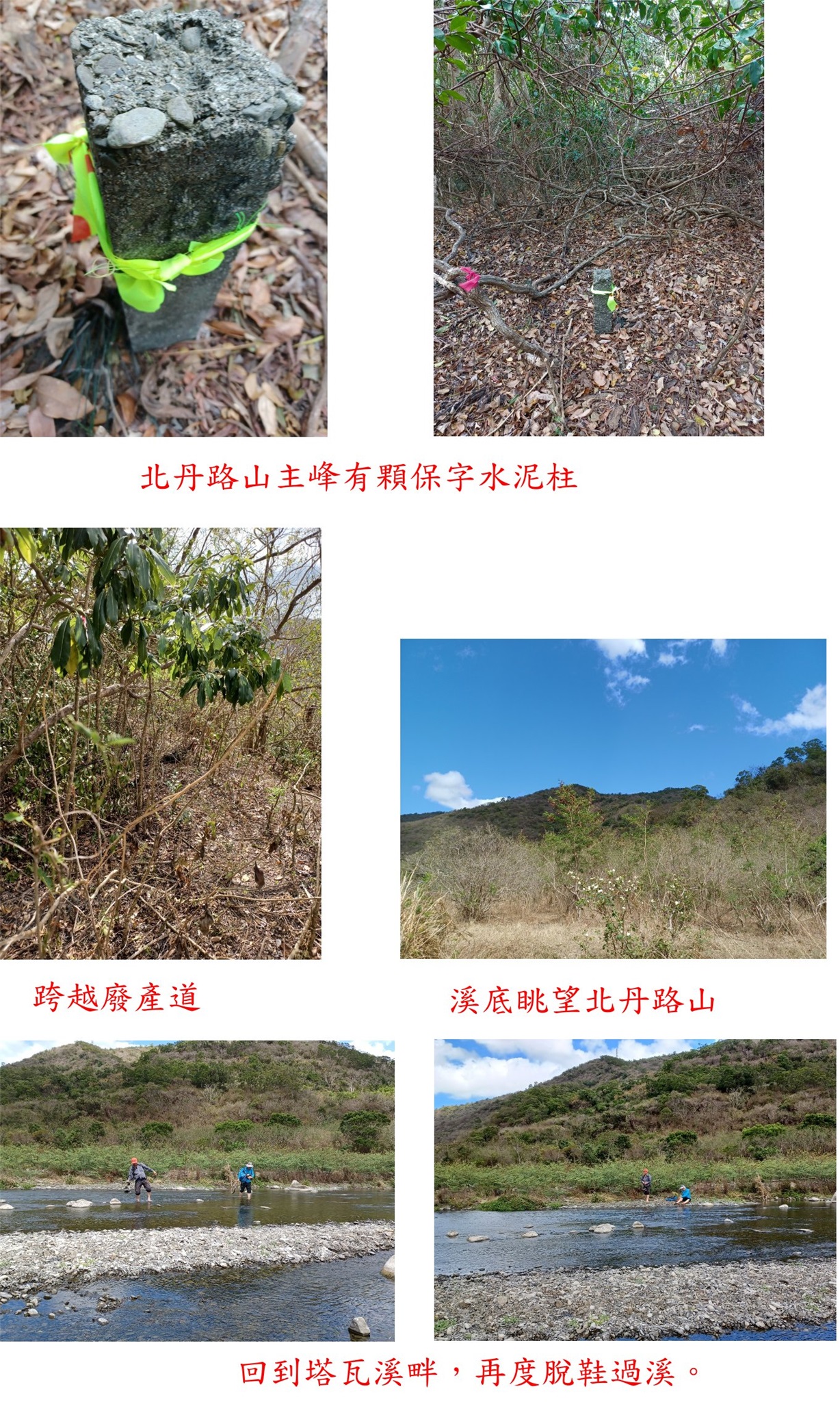 2/12早上先去走水坑山,再來去撿南迴公路遭周的基石;第1顆為上新路陸檢8439號,於台9線447.8K路左明顯好找;第2座為北丹路山的省政府圖根點,由台9線446.55K叉路下到高架橋橋下停車,下到塔瓦溪溪底涉水過溪,接到北岸土路走一小段至登山口上切,一路陡上接到小支稜,跨過廢產道隨即抵達北丹路山主峰的保字水泥柱,順稜下切抵達北丹路山省府圖根點,基石位置很奇怪於斜坡上,上山砍路走1小時又28分鐘,此山往返費時2小時又46分鐘,比預期稍難;第3座為東巴士墨山省政府圖根補點,於台9線444.2K叉路,取左過橋走產道上山,前段為水泥路後段轉為土路很難走,前行至約5.6K停車,走6分鐘即抵達基石。
