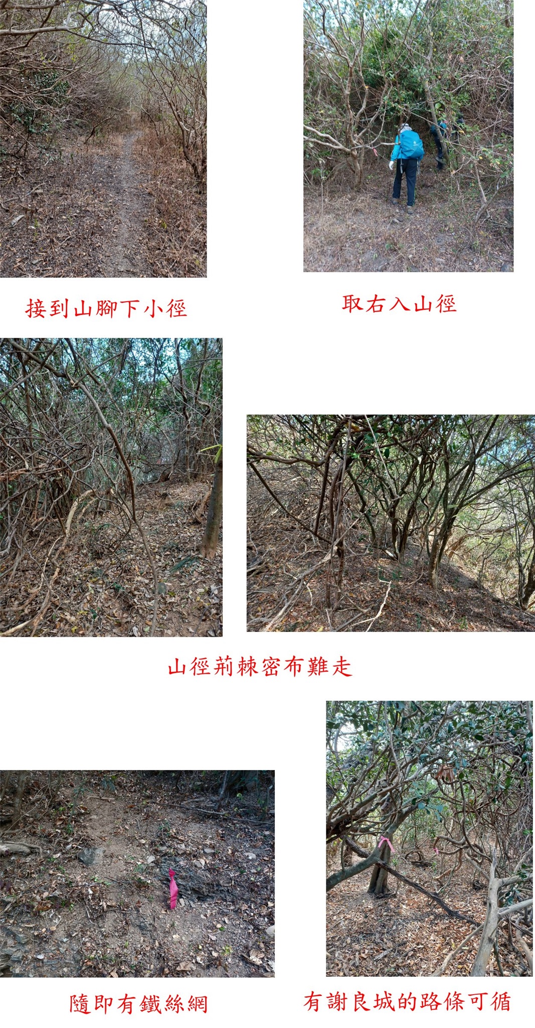 09:38取右入山徑,高77公尺,沿途有謝良城的路條可循、隨即有一鐵絲網;山徑一路陡上,沿途有氣根雀榕,路況比預期差,頗多刺柑等有刺植物,隊友於前砍路前進緩慢。
