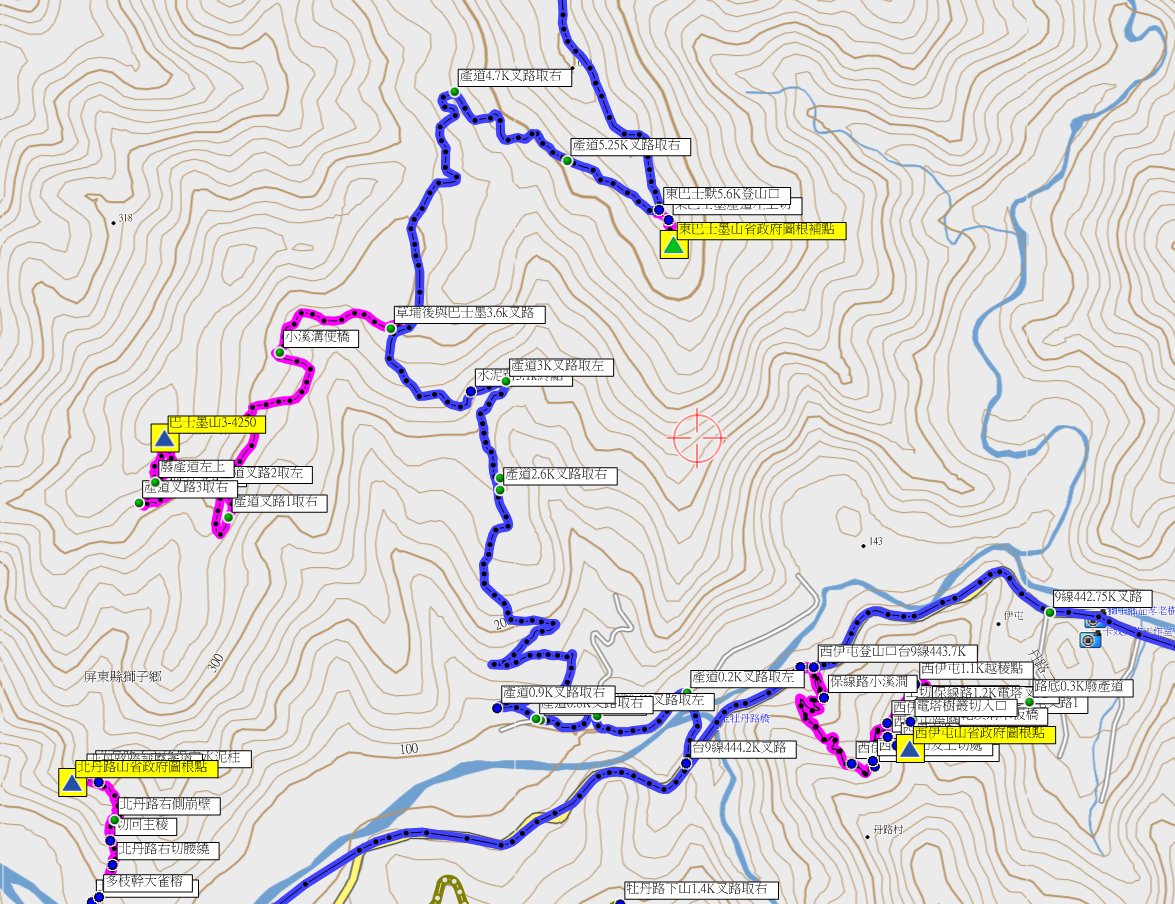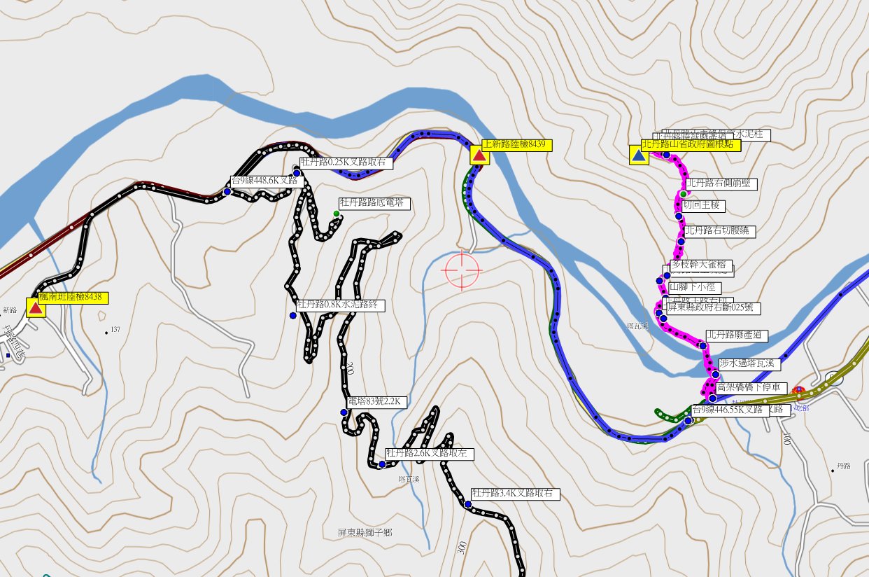 1、上新路:位於屏東縣獅子鄉,標高80公尺,一等水準點陸檢8439號基石;座標222171 2457106。