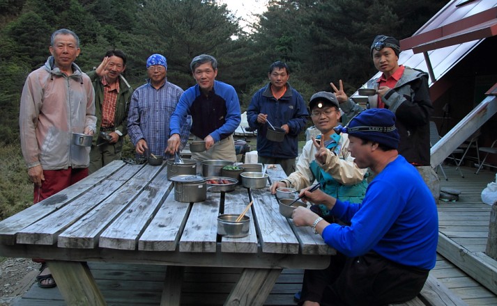 四點多,出現一隊人馬,是週三隊五人組,剛剛完成南二段,預備今夜與我們同住,然後還要去馬博橫斷,我以為他們的主要職業就是登山,別人分兩段的長程縱走,他們一次連起來走,諾大山屋夠我們住! 他們都是吃泡麵、慈濟香積飯,我吃兩天泡麵就想吐了,他們已經吃了六天,所以,阿寧哥與主席當下決定要辦桌請客了! 我們一堆公糧,原本還想背到東埔街上去請人代煮哩,現在煮來請客,可謂適得其時,阿寧哥煮的高興,大家吃的感動!