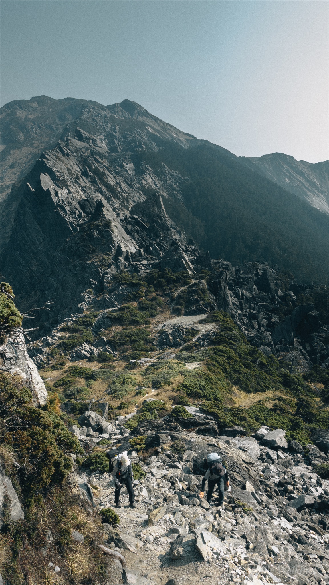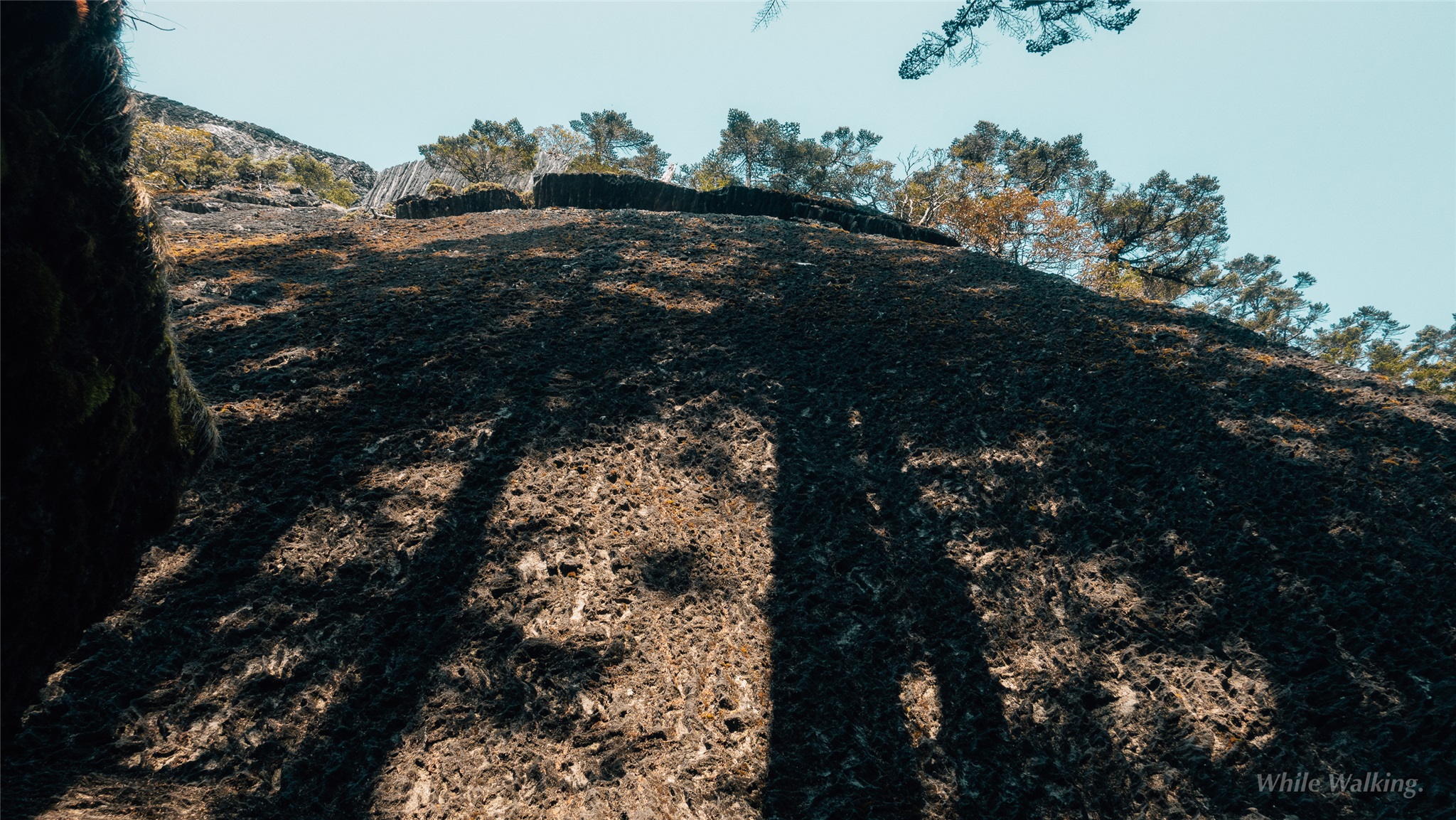 石壁其實不算難走,地質雖然破碎且旁邊的坡度較陡,但因為沒有下方草原箭竹、小檗等植披覆蓋,在本日的下午行程中算是最好走的一段了。