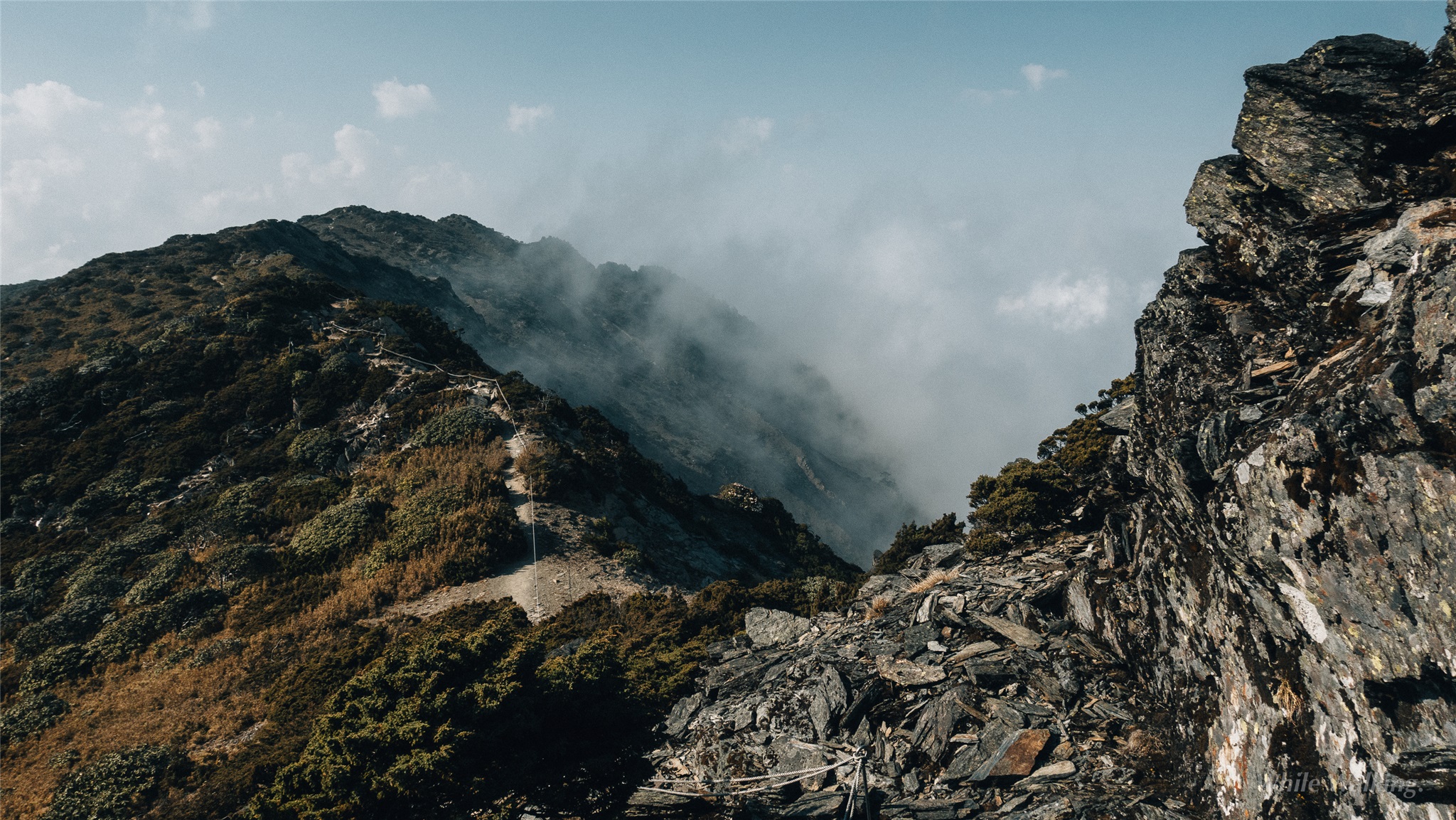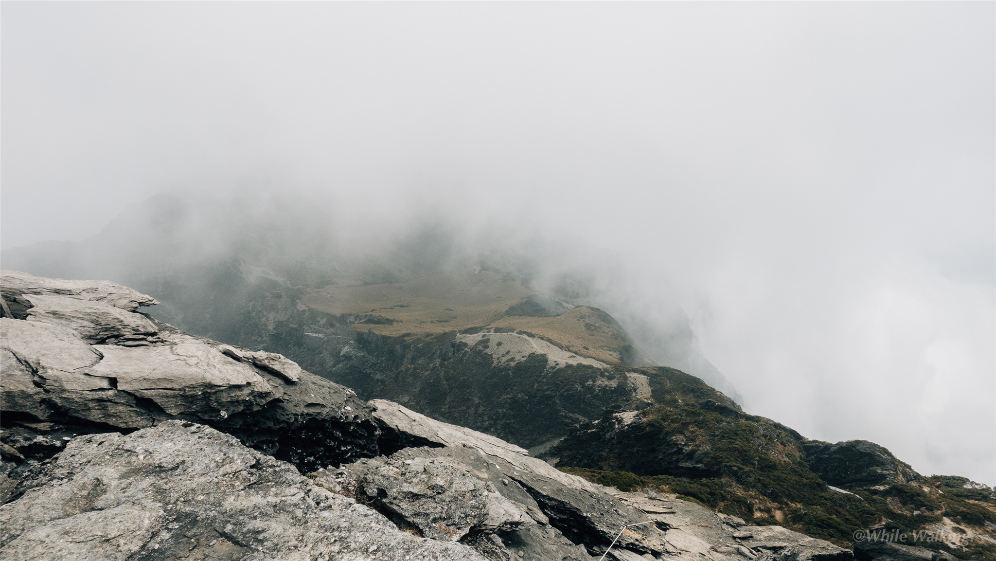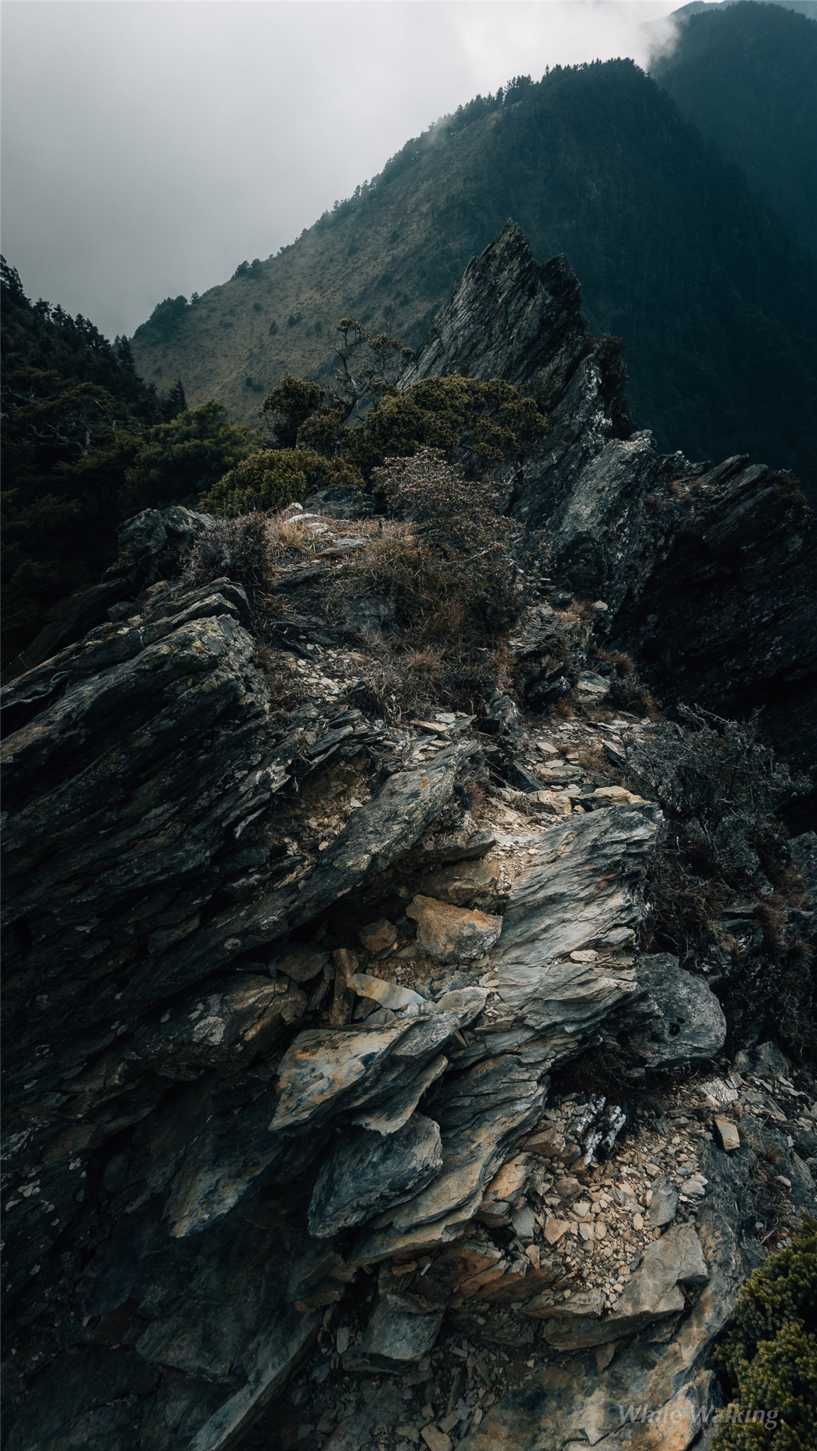 在這之後,開始有了岩壁等地形,對比在箭竹林中前進,這樣的地形更為舒服、好走。甚至在到觀景大平台前,已經有可以明顯辨識的路徑了。