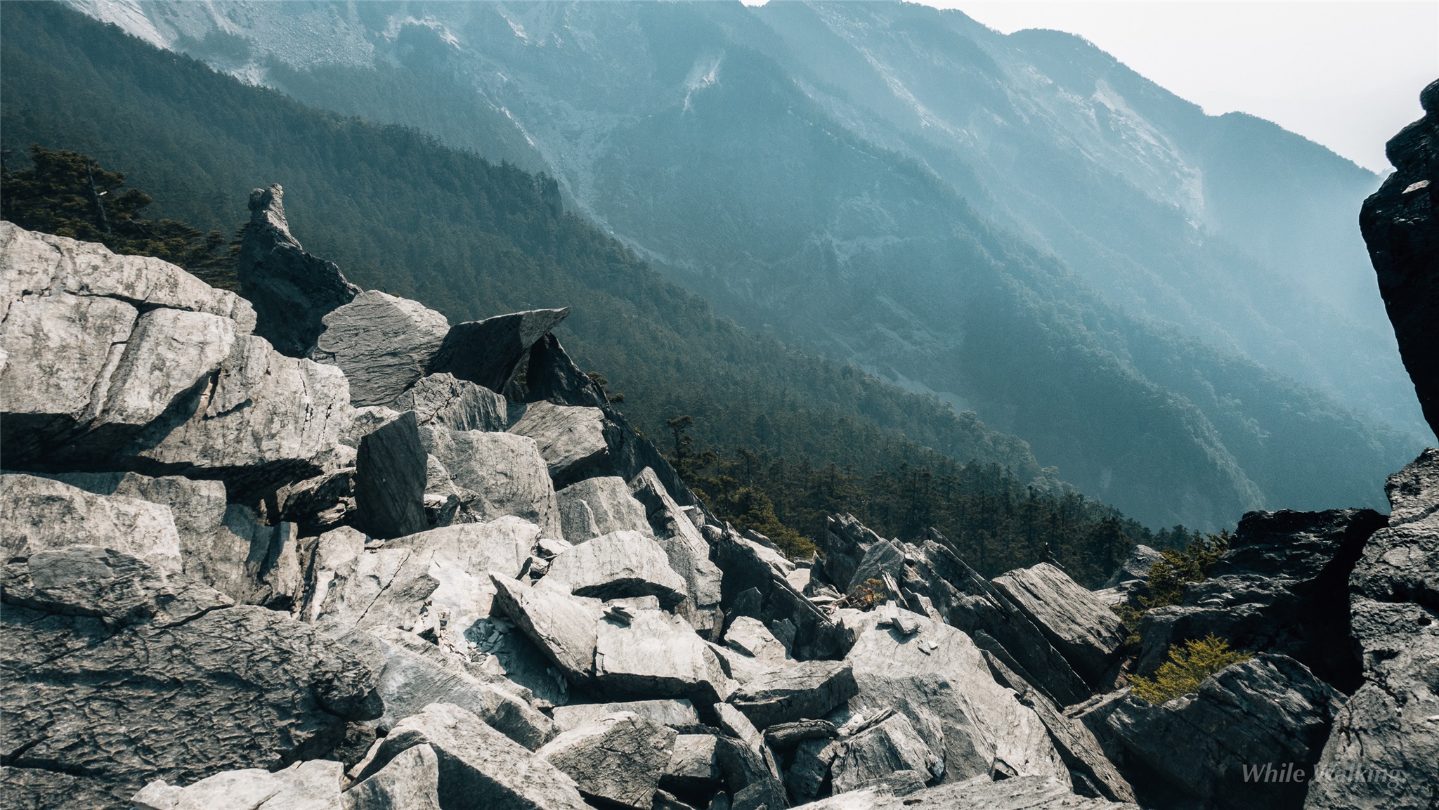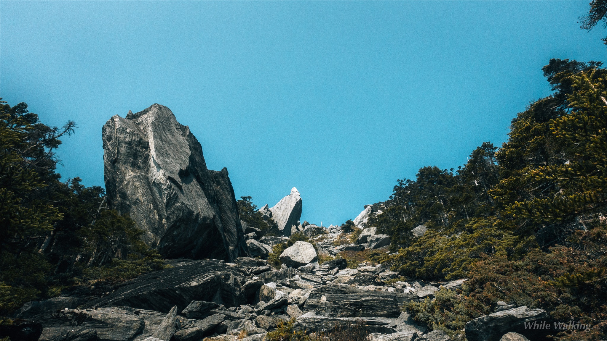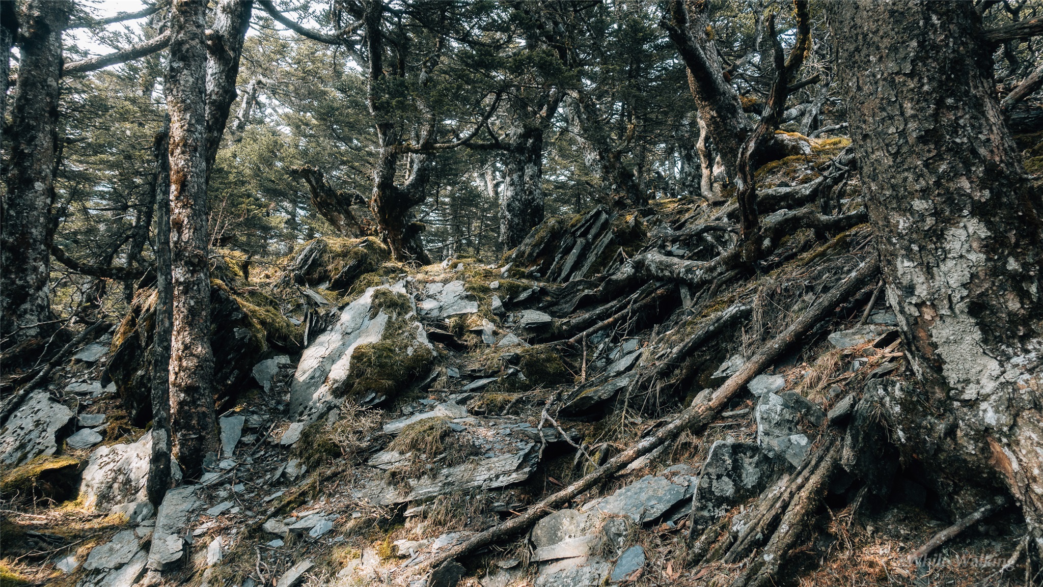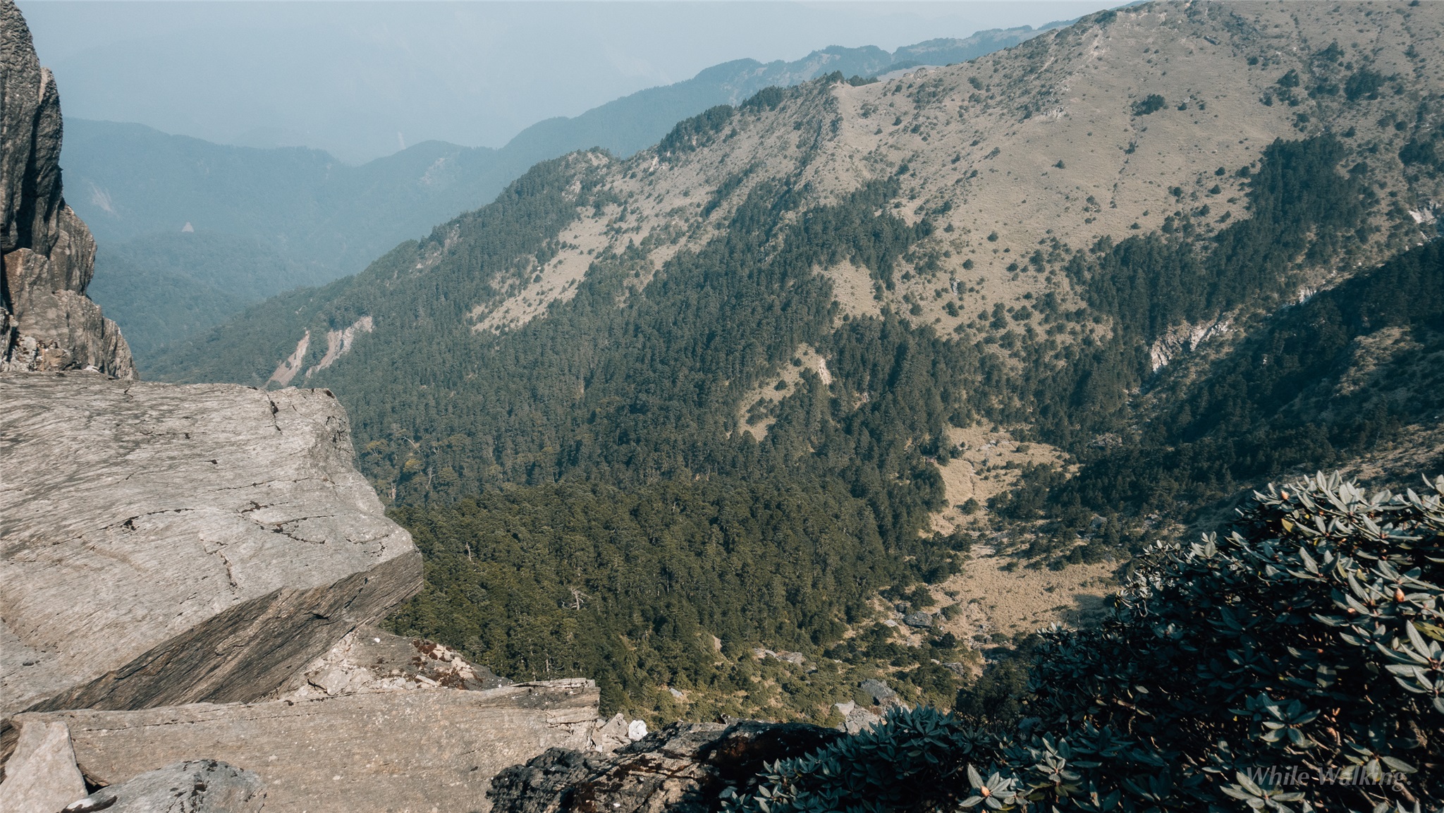 在這之後,開始有了岩壁等地形,對比在箭竹林中前進,這樣的地形更為舒服、好走。甚至在到觀景大平台前,已經有可以明顯辨識的路徑了。