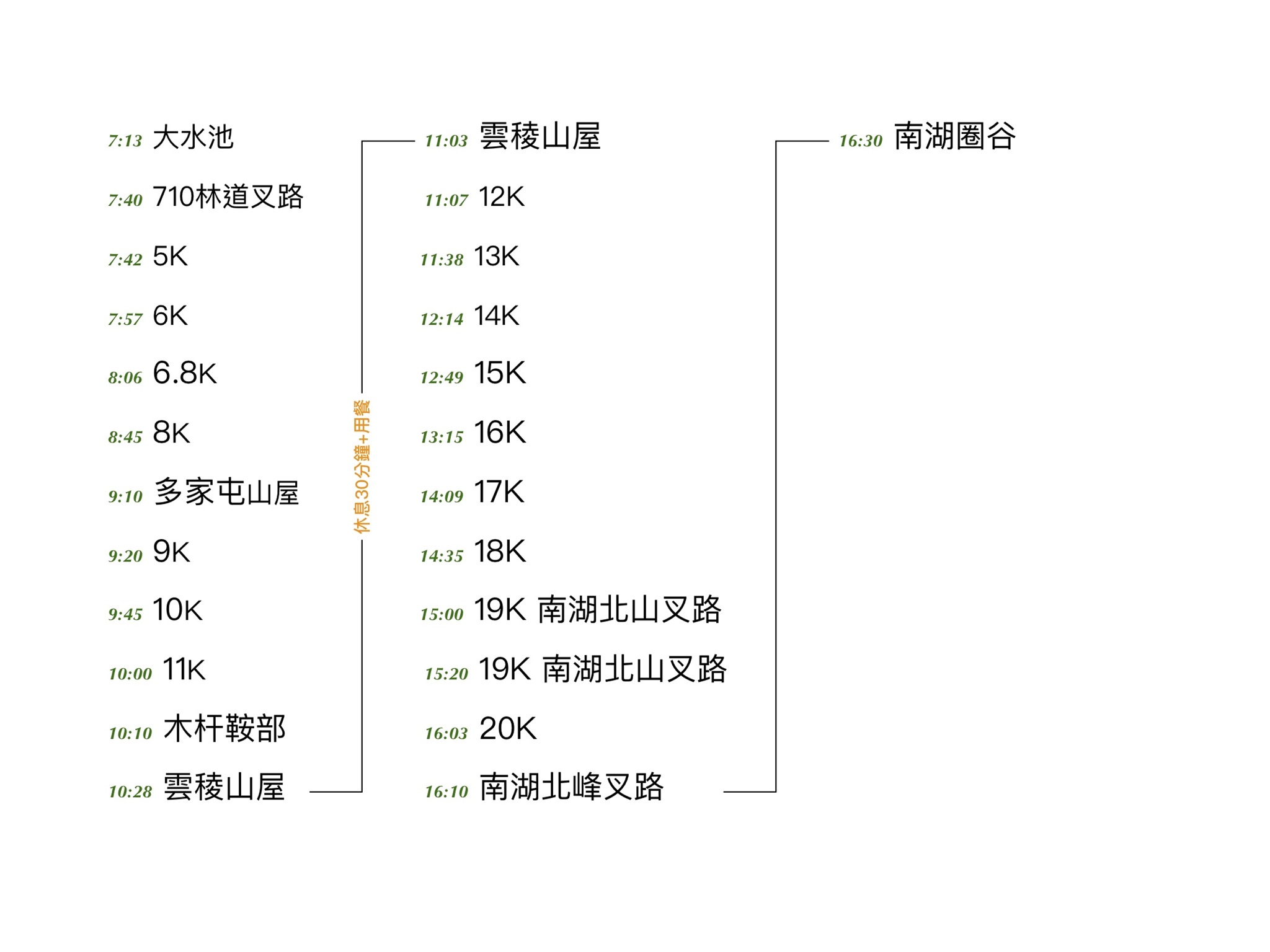 從後續數據來看,在雲稜山屋前都可以維持13~14分/公里 上下的速率,在這之後遂驟降至20~30分/公里甚至是40分/公里的速率,最根本的原因還是拜海拔、地形以及累積的疲憊感所賜。