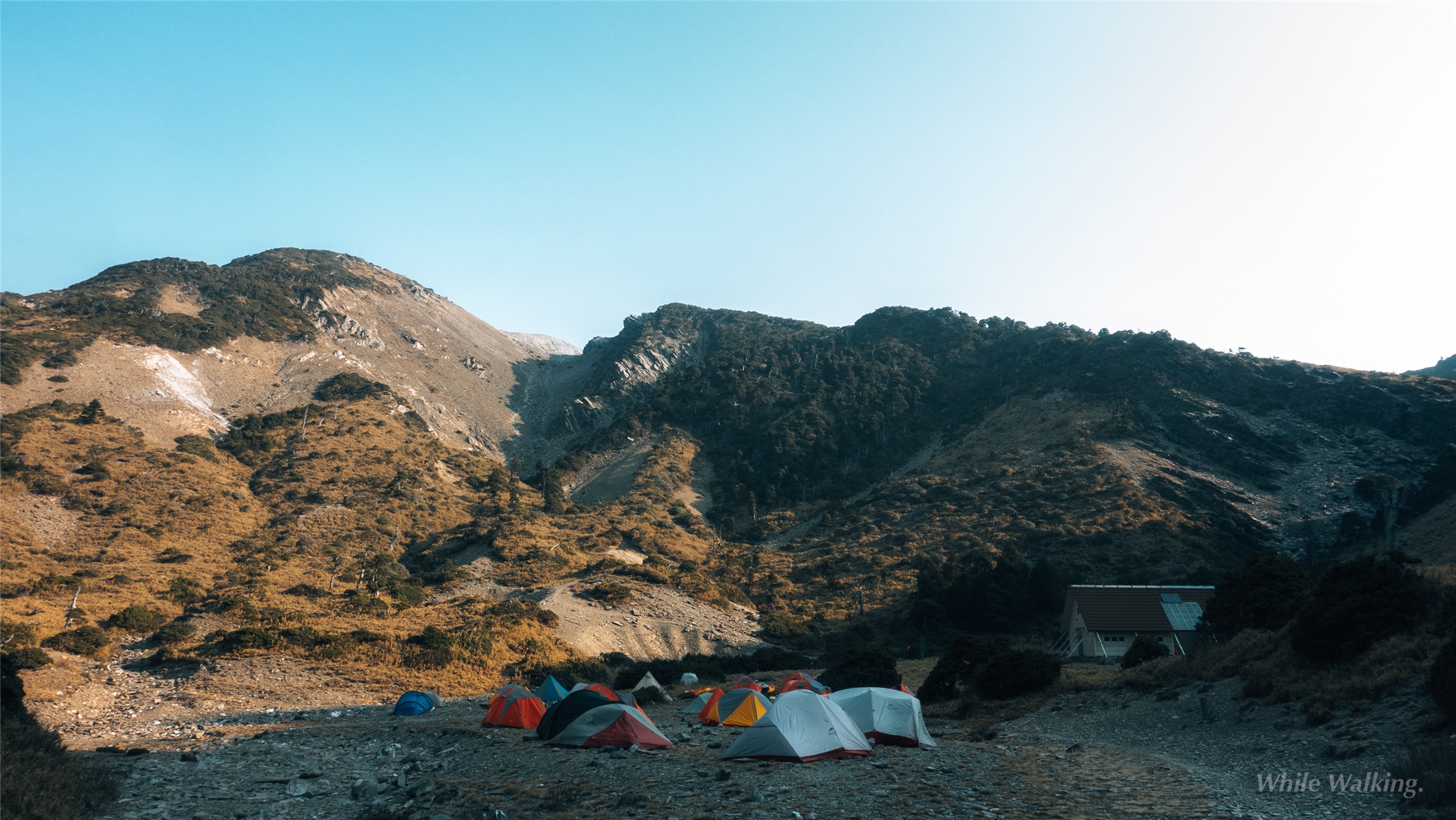 山屋附近營地僅有三頂帳,跟一旁已搭好的山友打過招呼後把帳篷搭好,取水、煮食、伸展,睡前還去溪邊梳洗了一下便早早睡去。
