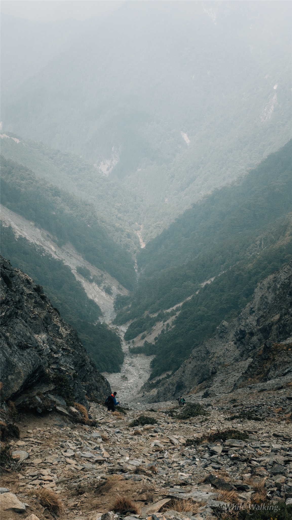 一路傾瀉而下的碎石坡直到中央尖溪,接下來是沿著中央尖溪經中央尖溪山屋-香菇寮-南湖溪山屋,戴起耳機、小心腳步一路下山去。