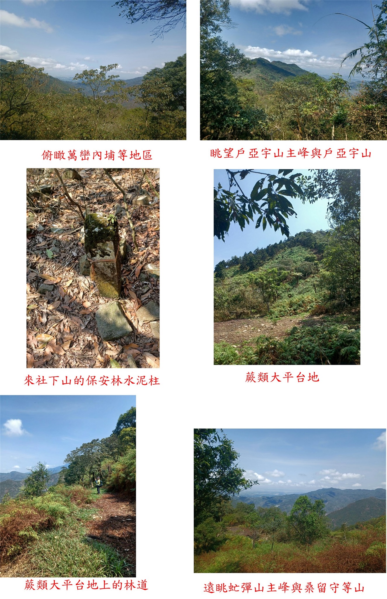 10:20蕨類大平台地,上方山坡長滿蕨類,視野頗佳,西北面俯瞰瓦魯斯溪與萬巒等地區,北面遠眺虻彈山主峰與桑留守等山;山徑靠右樹林邊行。