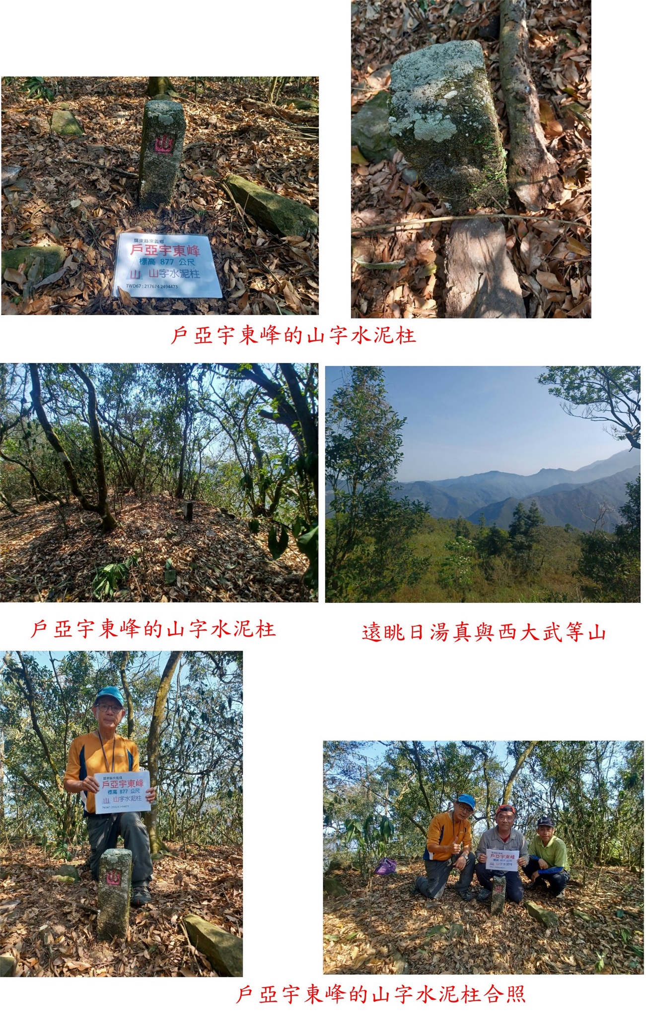 2、戶亞宇東峰:位於屏東縣來義鄉,標高873公尺,山字水泥柱;座標217669 2494476。