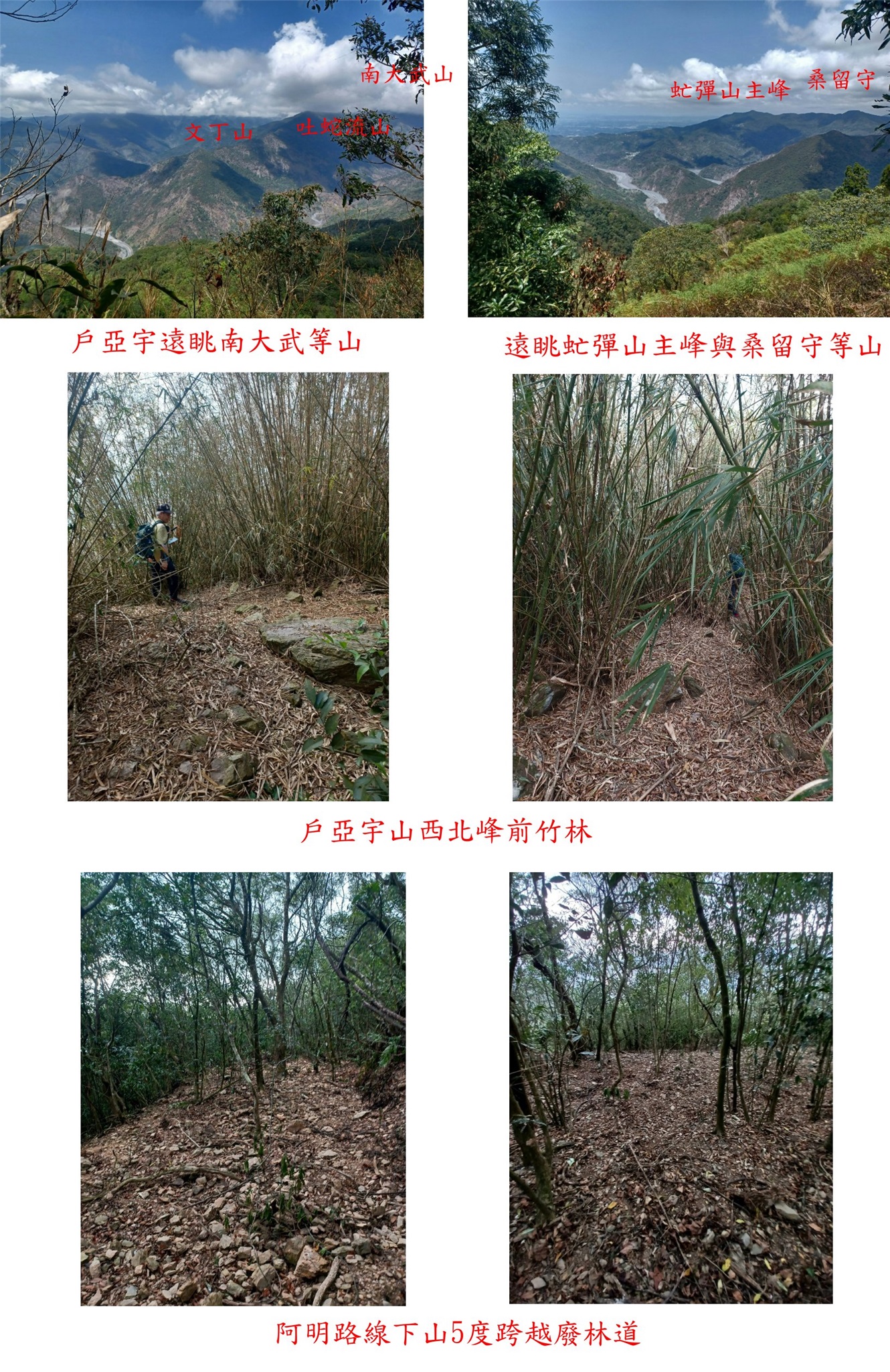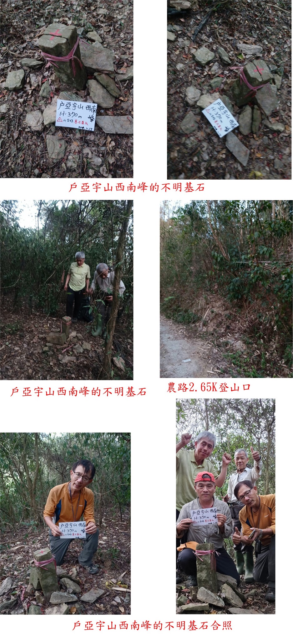 6、戶亞宇山西南峰:位於屏東縣來義鄉,標高384公尺,山字水泥柱找不到,另有顆不明自然石;座標215012 2492913。