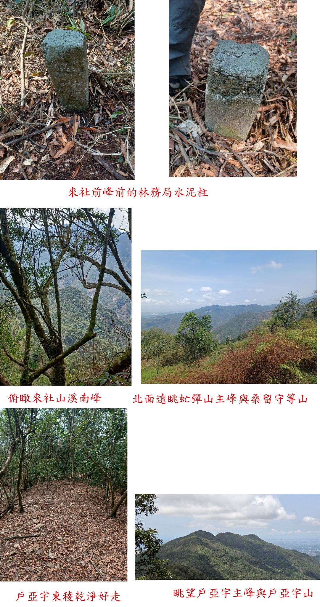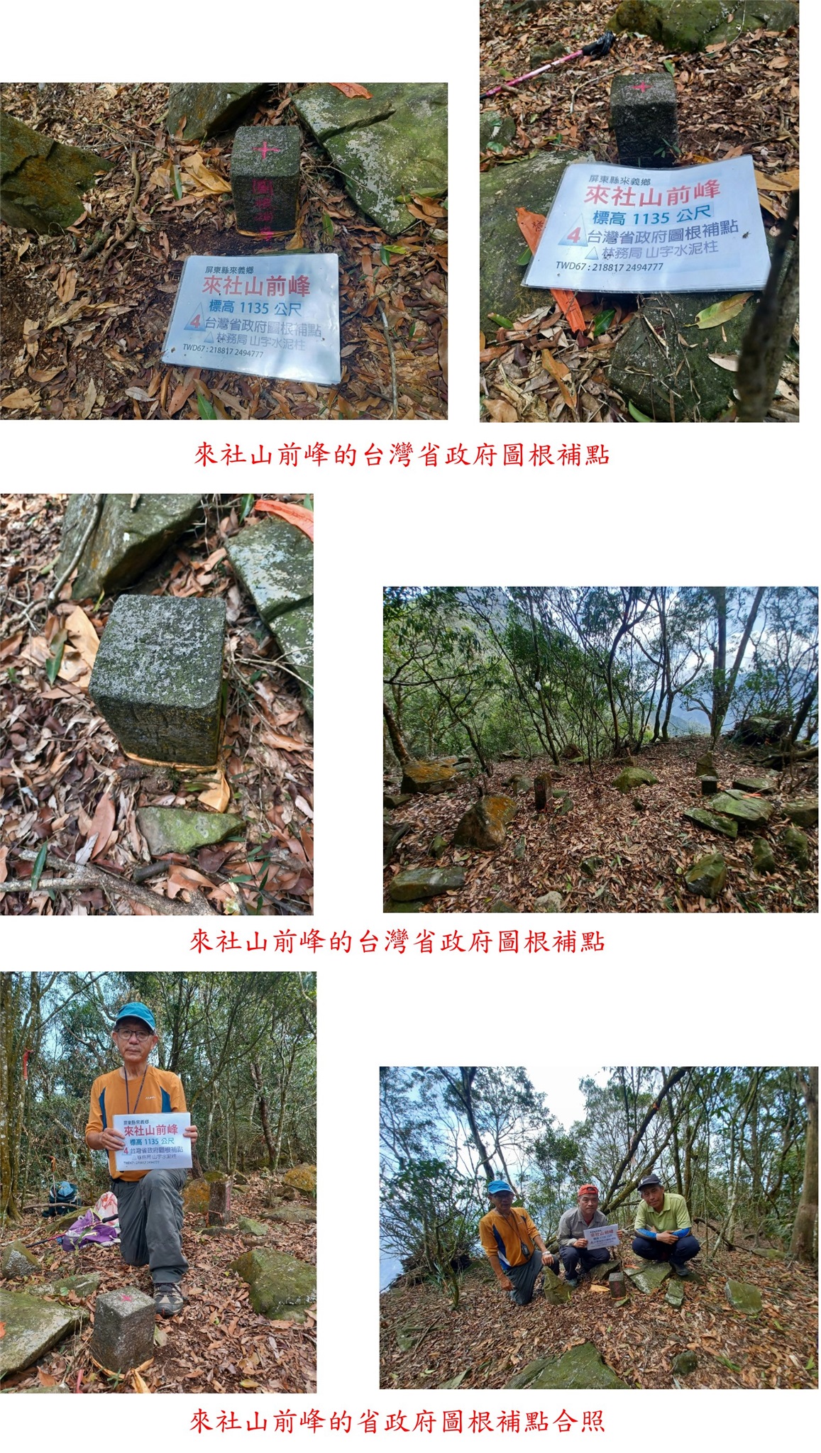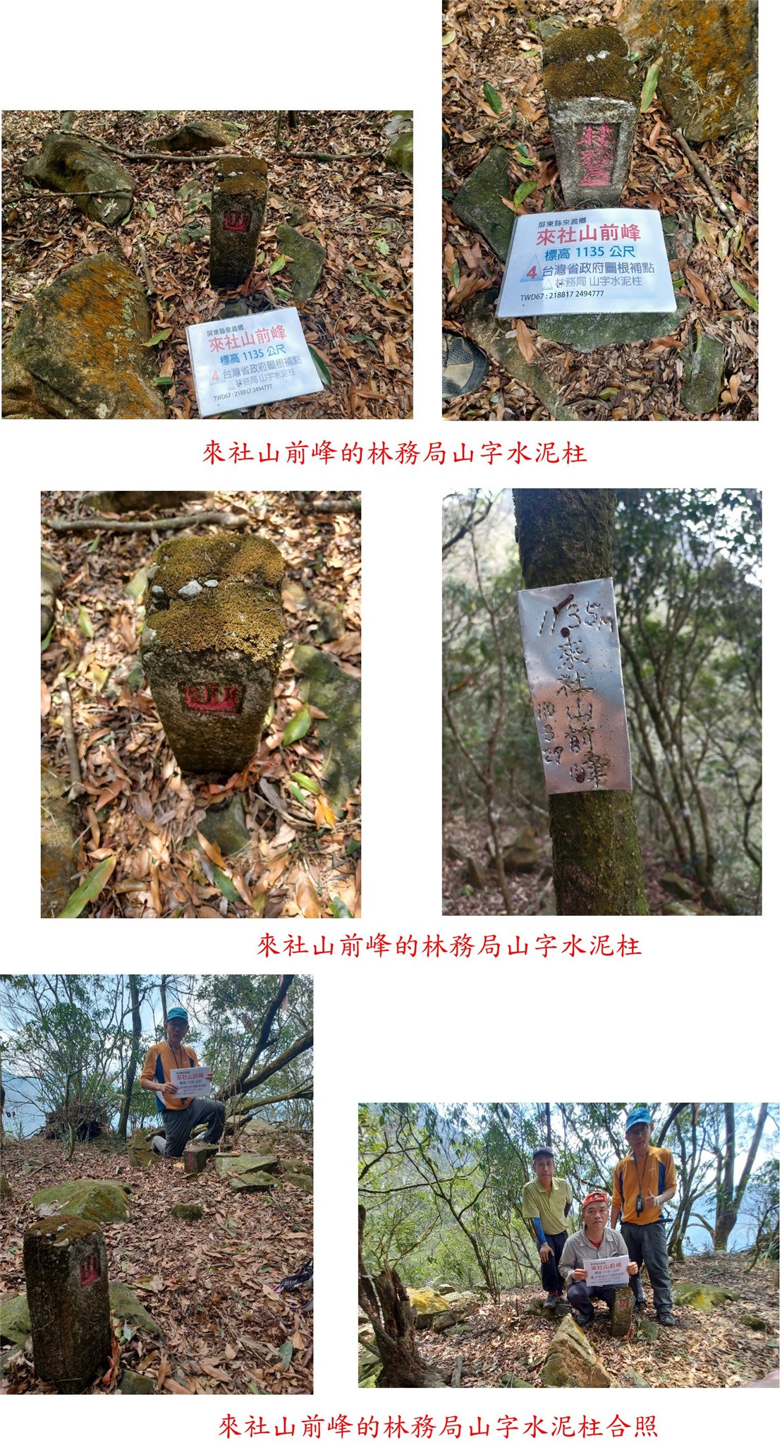 3、來社山前峰:位於屏東縣來義鄉,標高1135公尺,台灣省政府圖根補點與林務局山字水泥柱;座標218801 2494765。