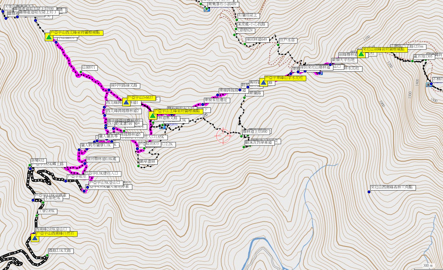 由戶亞宇5K登山口走農路原路回到2.65K停車,基石直線距離40餘公尺。