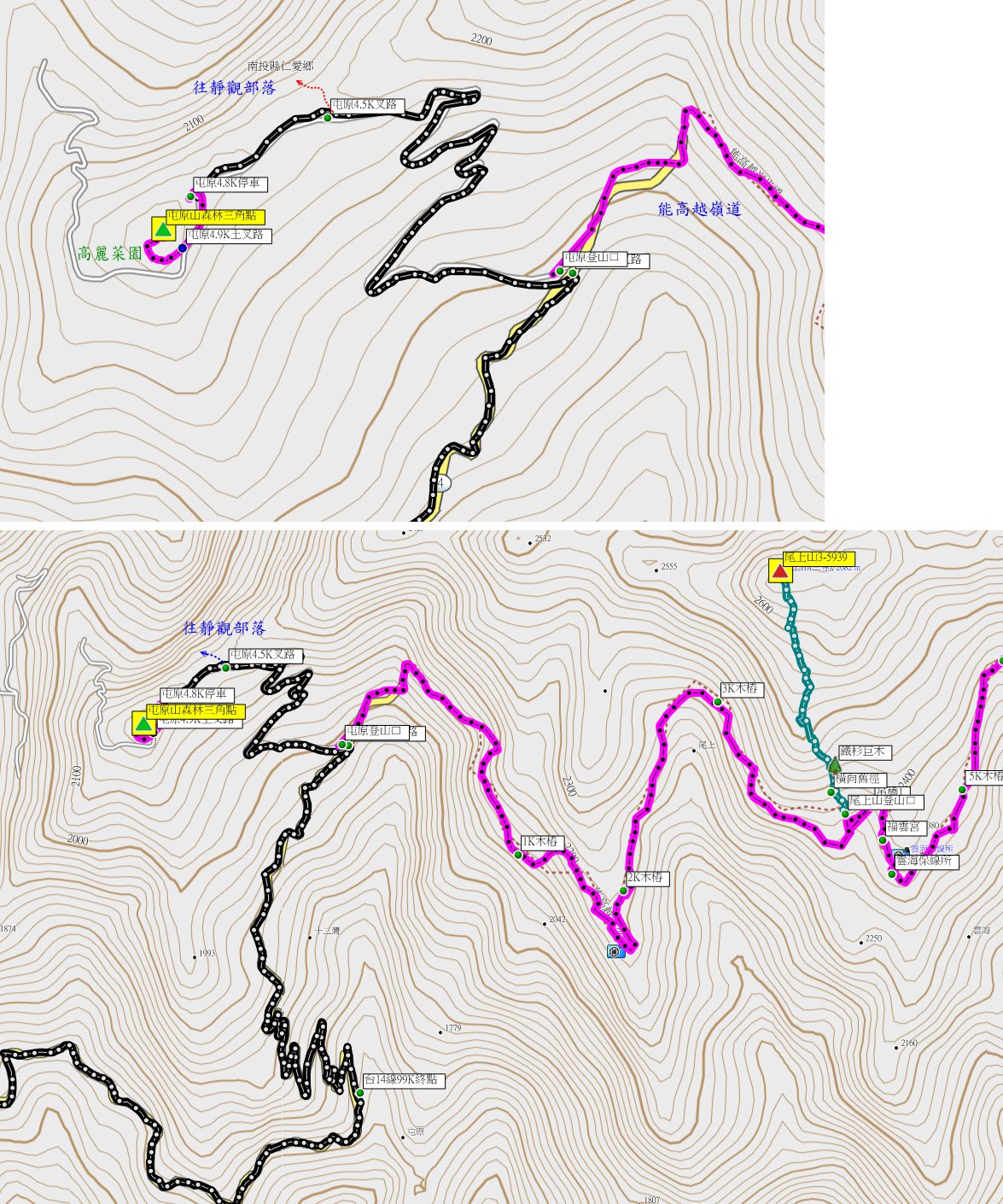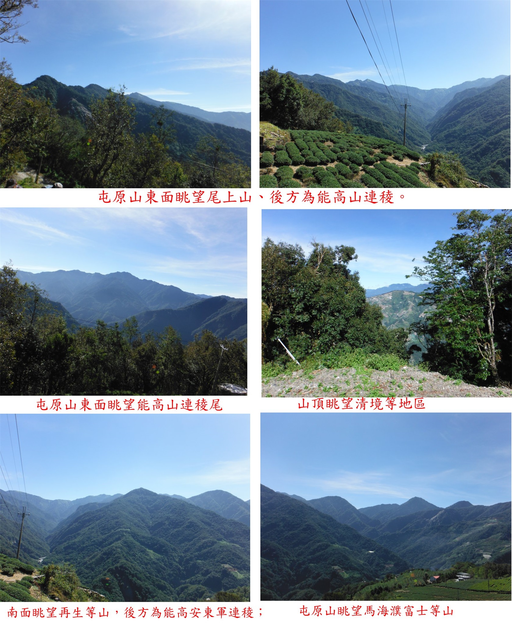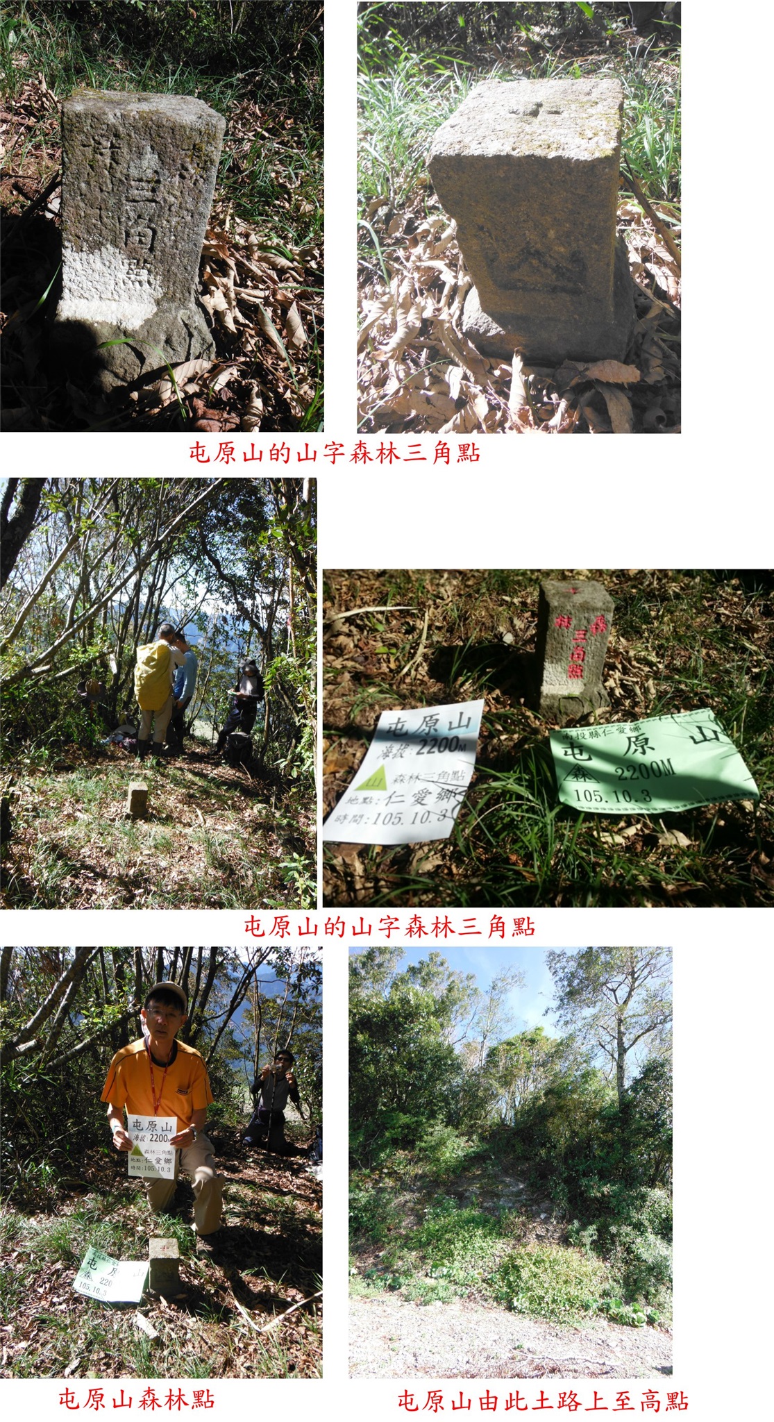 1、屯原山:位於南投縣仁愛鄉,標高2200公尺,森林三角點;座標270255 2660955。