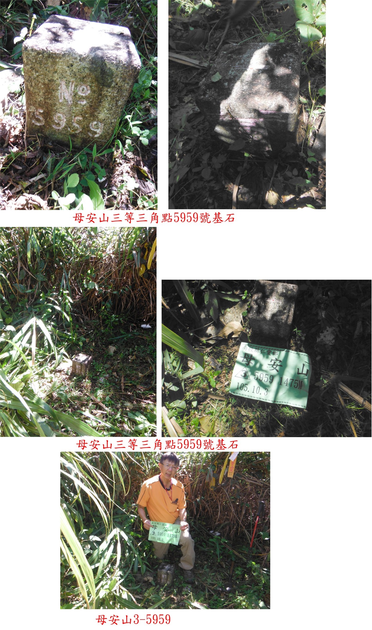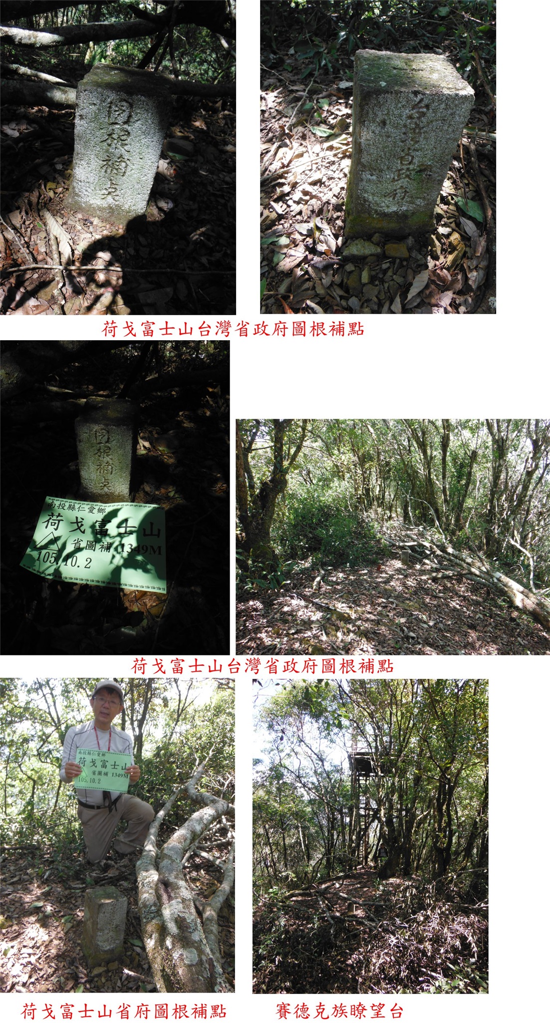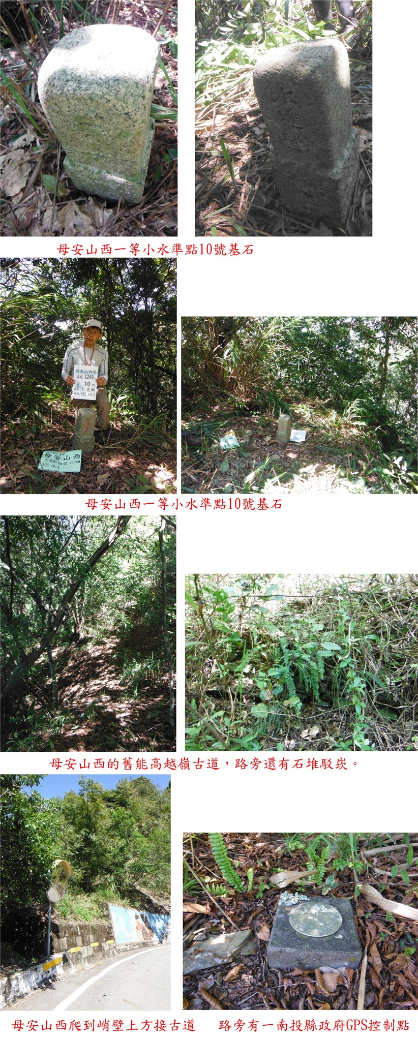 10/2-10/4約山友至埔里等地區爬山,10/3第二天的行程早上第1座的屯原山森林點於菜園的上方,路程很遙遠、但上山只要9分鐘、輕易入袋:第2座的母安山主峰車可直達,曾去過當時省府圖根補點尚在、現已遺失,只剩下林管處G031林地控制點;第3座的母安山3-5959於路的上方,基石於芒草中要稍為砍一下,上去走10分鐘,此點早已來過;第4顆的母安山西水準點10號於能高越嶺古道旁,爬上古道要克服一小段峭壁地形,基石超難找,短短的距離走了28分鐘,超冷門的基石;第5座的荷戈富士山省府圖根補點,走東北面的步道上山只要9分鐘,視野佳值得推薦的郊山。