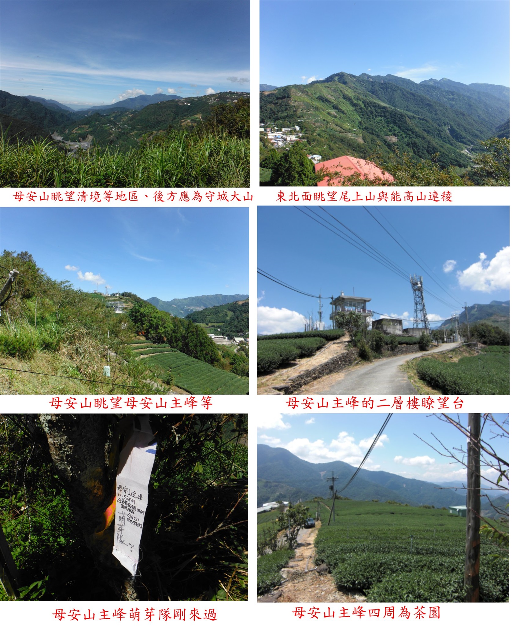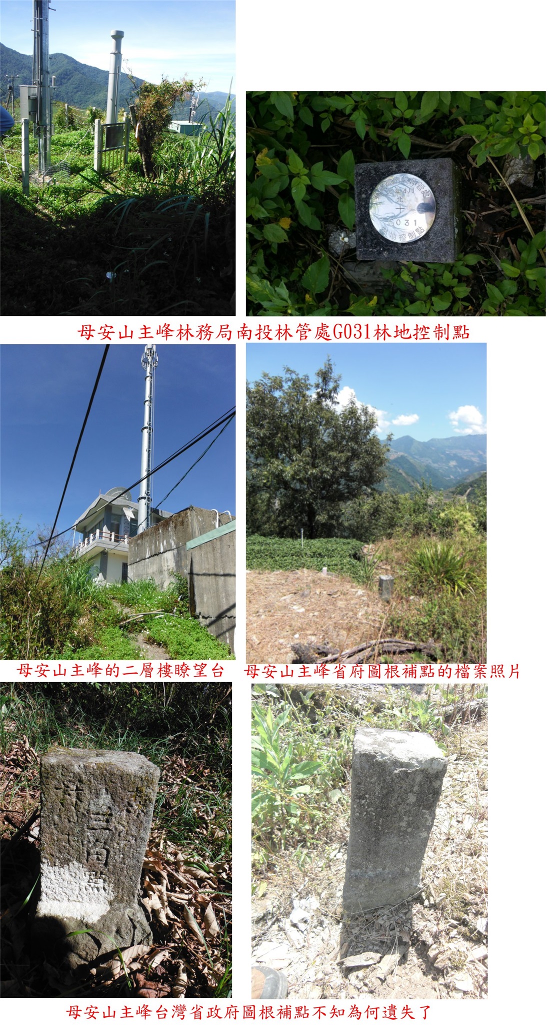 取左上至路旁的瞭望台,7年前來時母安山最高峰省府圖根補點於屋旁靠近茶園處,不知為何會遺失?只剩下林管處G031林地控制點,旁有雨量計;視野頗佳,東北面眺望尾上山與能高山連稜,東南面眺望眺望再生等山,西面眺望朗土府山、清境等地區。
