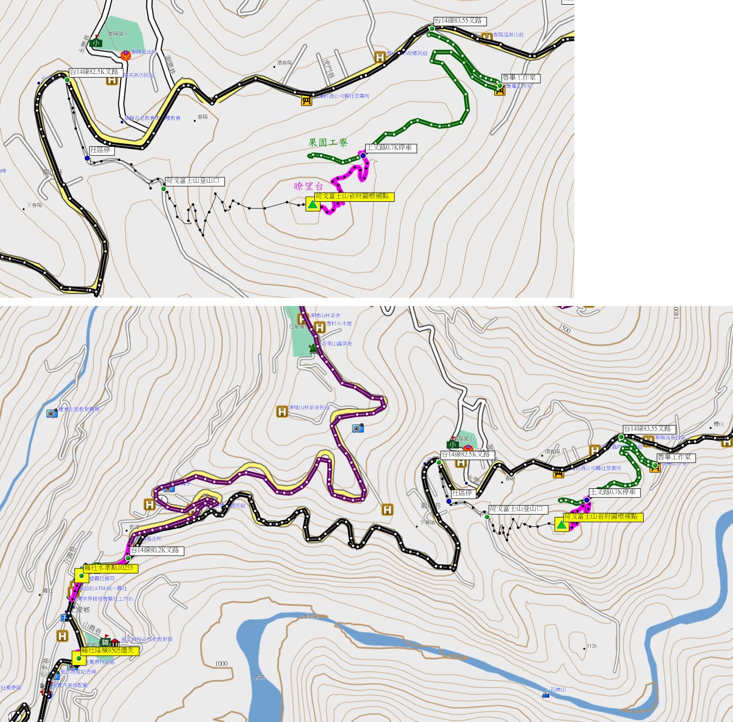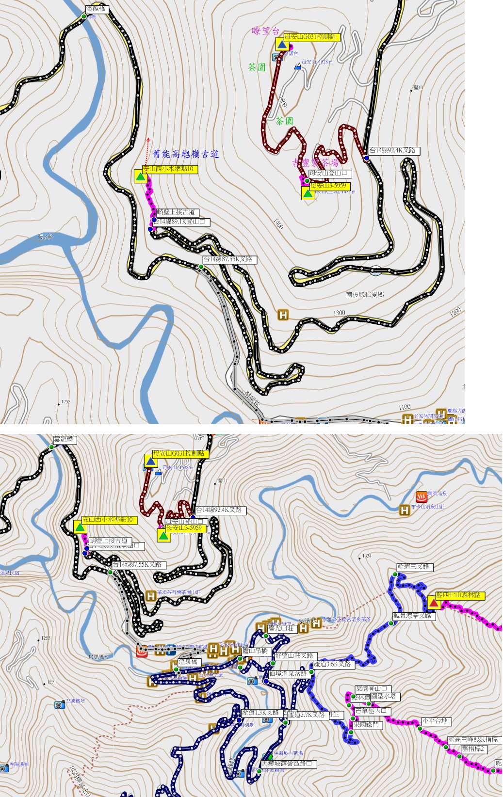 由屯原山原路回至14線終點99K處,走台14線往霧社方向回92.4K叉路【0K】,路口有吉豐製茶場指標;取右小水泥路農路走0.55K叉路,左往母安山3-5959先不取,續行先往母安山最高峰,茶園的農路很狹窄,至1.2K的路底停車;前有通訊鐵塔,山頂有間二層樓瞭望台。