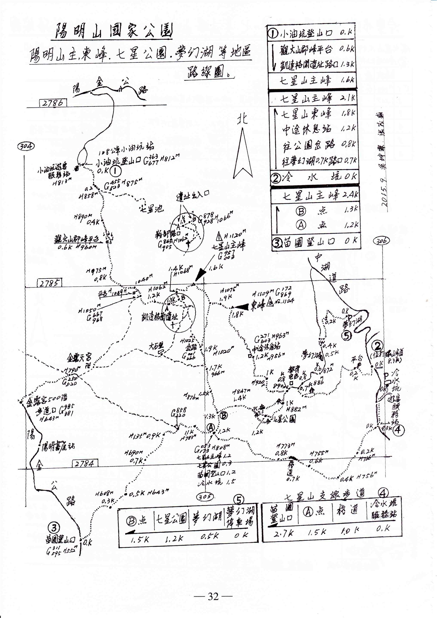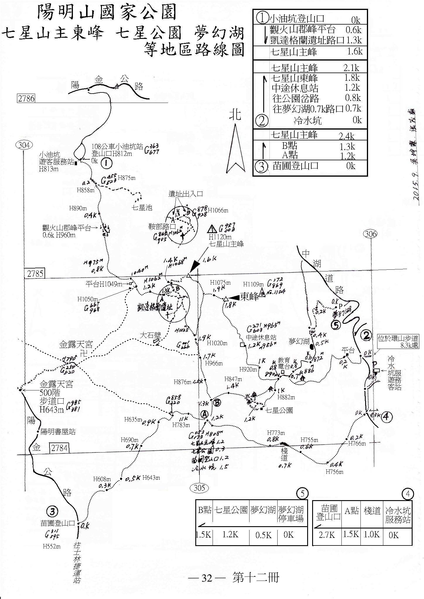 (十二032) 陽明山、七星山、主東峰、七星公園、夢幻湖等地區路線圖 2015年9月