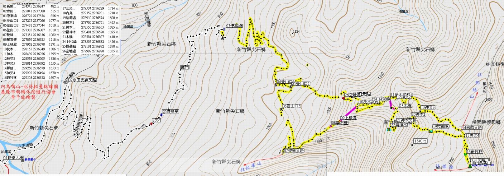 然翻閱網上記錄,第三登山口上登內鳥嘴山的行程航跡記錄,未曾有人提供,故借今日活動之便,與黑龍兄2人順探此段路徑,原來這條路線可從拉庫山稜線,接抵「回音谷」與第一、二登山口來路會合,不過地形陡峭困難度較高,難怪造訪者少,我們已經製作了GPS航點資料,提供給山友參考。