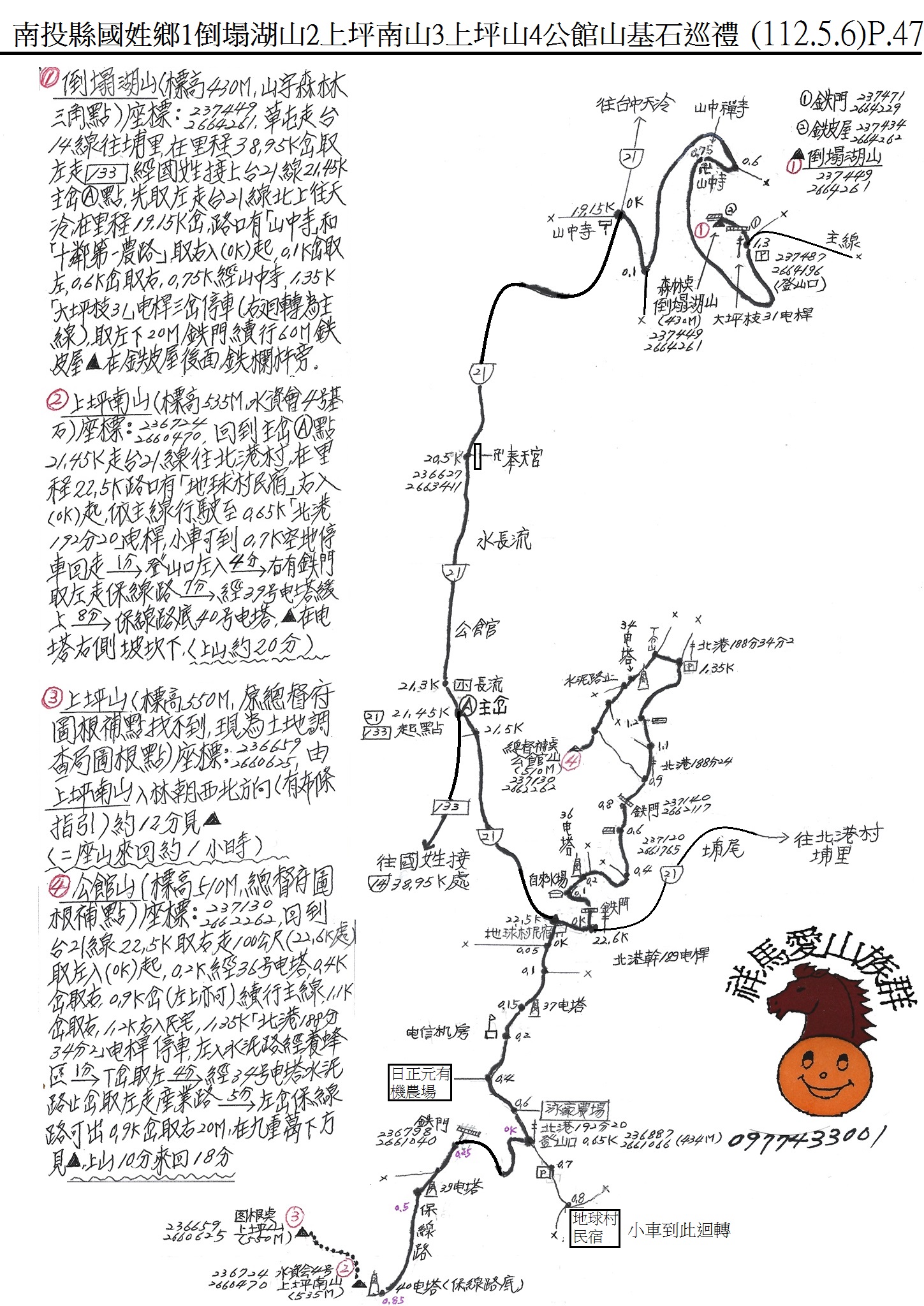 5上坪南山和上坪山入口在台21線往北港村,在里程22.5K「地球村民宿」右入