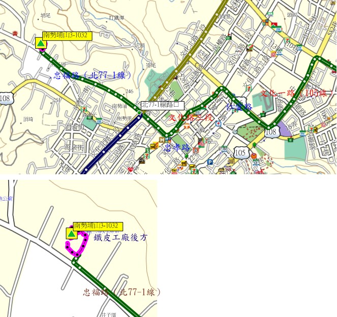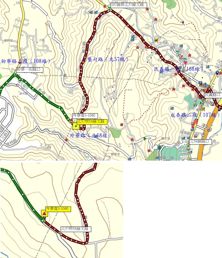 由外寮崙山續走北57線(粉寮一街)走1.3K,左轉粉寮路二段(108線)往林口市區走1.3K,右轉中山路(106線)走1.4K;左轉文化一路(105線)走0.9K,右轉仁愛路走0.65K,左轉文化路三段0.75K,右轉忠孝路0.35K,前接忠福路(北77-1線)走1.2K叉路,路口有亞立達工業標示,右入