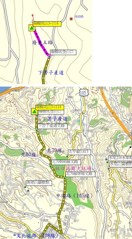 由南勢埔北77-1線往林口市區走1.2K,左轉文化北路(108線)走2.5K,右轉中華路走0.5K,左轉中湖路(105線)走1.9K至林口高爾夫球場叉路;左轉北79線走0.75K叉路(直為北80線),右轉仍為北79線走1.6K,續右轉下罟子產道走