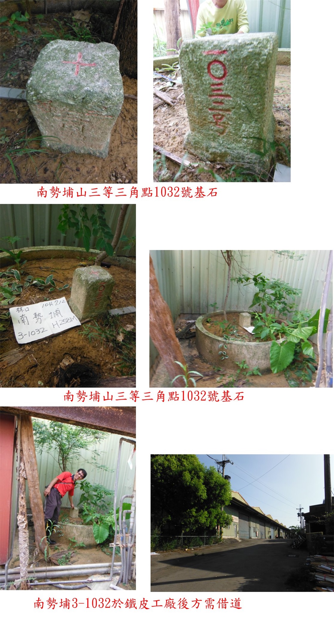 南勢埔的基石於左側那排鐵皮工廠後方,工廠後方有圍籬不易爬過去,基石於左側算來第3間工廠後面、但假日休息未開(前由此進入);隔壁有家「朝日工程」有開,拜託老闆開後面進入二邊被封死的防火巷,往左走十餘公尺即見到南勢埔山3-1032;基點位於水泥圈起高出地面之土堆上,此基石12年前曾來過,陪信堯與阿祥再來一次,找此點只要有禮貌拜託一下借道工廠應無問題。