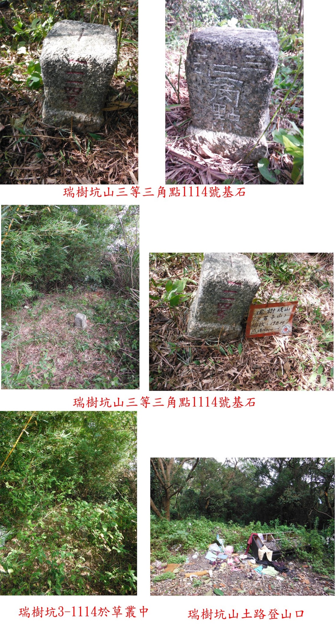 最近在整理以前登山的紀錄,發現早期有些基石未有照片(或紀錄),周日約幾位山友去補,順路找桃園地區幾顆遺漏的基石;首先的外寮崙山3-1040於路旁,只要走1分鐘即輕鬆入袋;再來的南勢埔3-1032於鐵皮工廠後方需借道,曾來過陪大家再來一次;第三座瑞樹坑3-1114來補照片,上山只要6分鐘,輕易達陣。