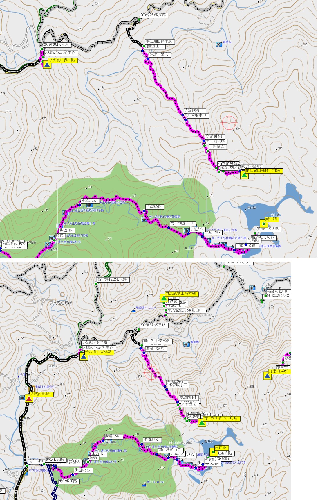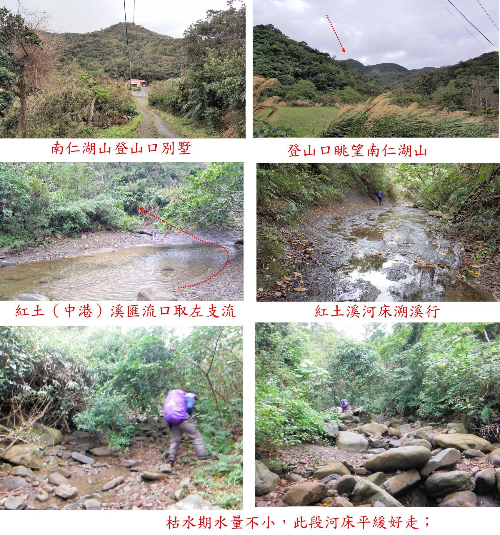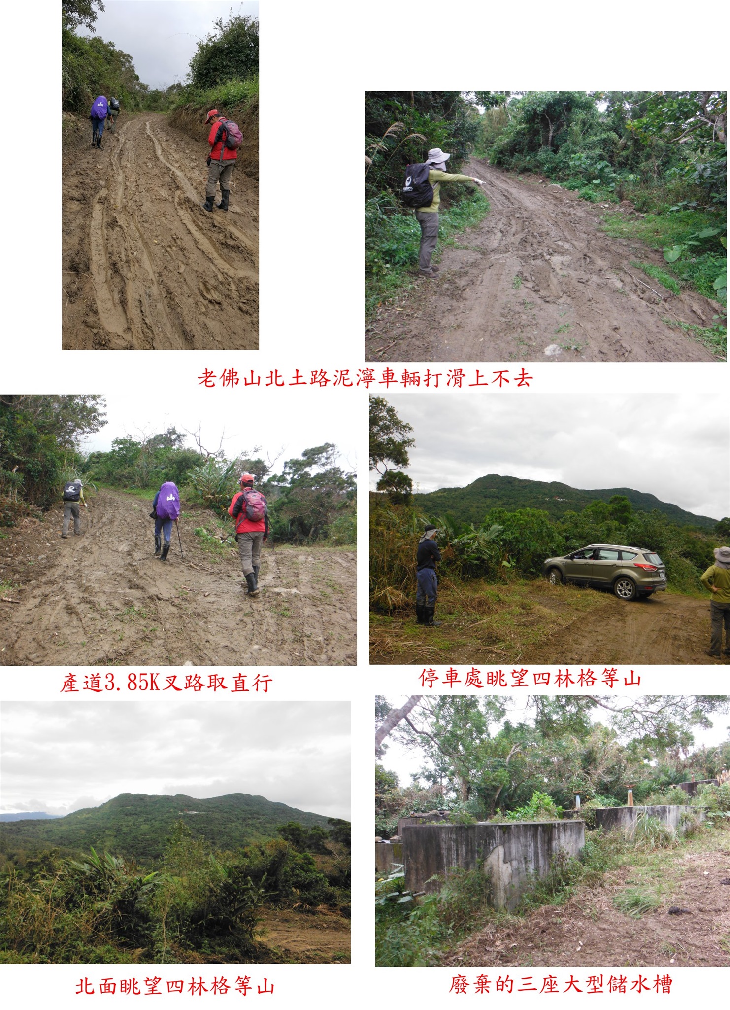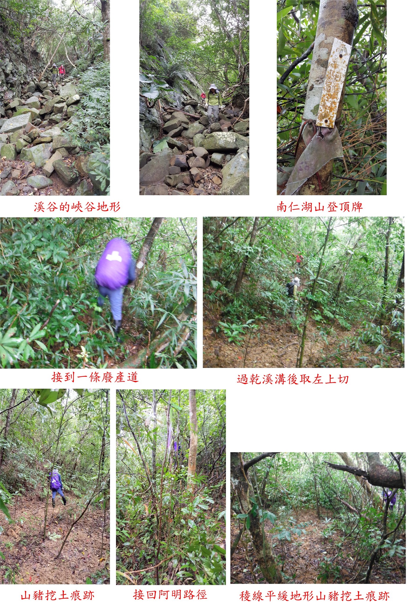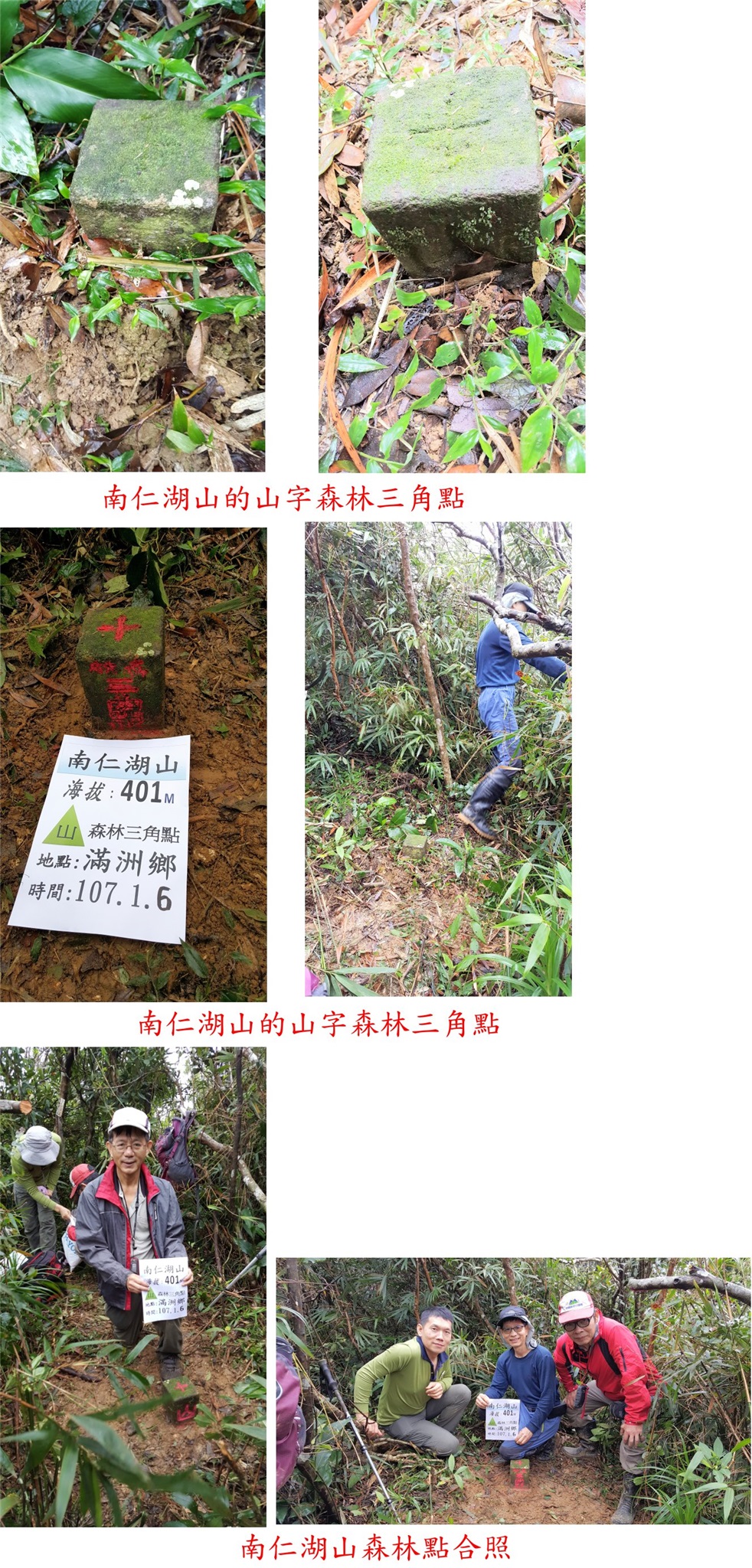 1/5-1/8因避雨約山友來到屏東的墾丁地區登山,第二天(1/6)雨終於停了,第1座的南仁湖山森林點,此山舊時由南仁湖上登的路線,因列入保護區此山幾乎已被山友遺忘,阿明教授由北面另闢新路線成功上登,此路線溯紅土溪而行,去程走約3小時,往返費時5小時又20分鐘,此路線稍遠但沒什麼危險地形;第2座為老佛山北峰森林點,此山有夠荒涼去的山友少之又少,產道泥濘提早停車,直線只有1.1公里,此行走阿明的新闢的路線,上山走了2小時40分,往返費時4小時又29分鐘;今日的二座山路已砍過有興趣的山友快成行。
