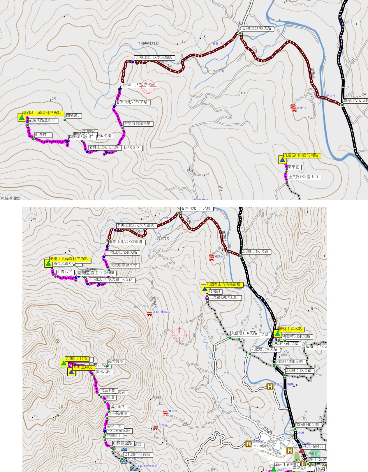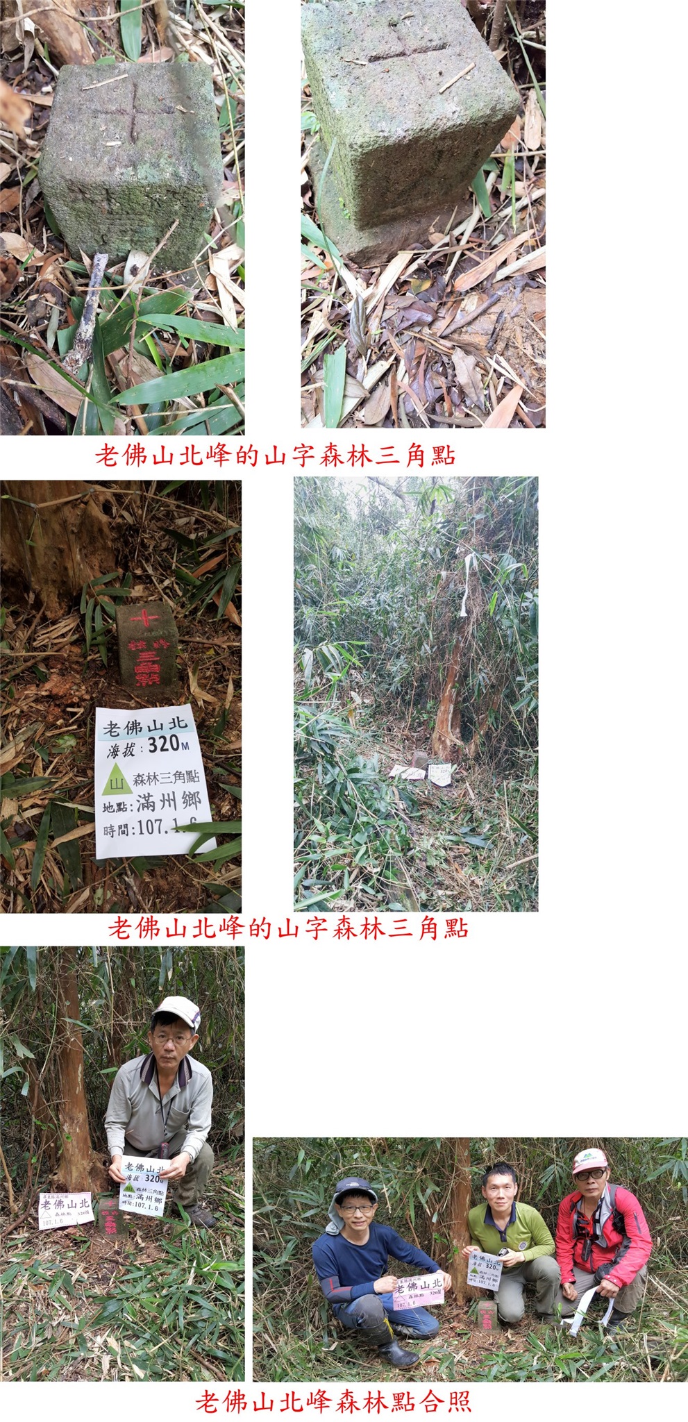 2、老佛山北峰:位於屏東縣滿州鄉,標高320公尺,森林三角點;座標227394 2439795。