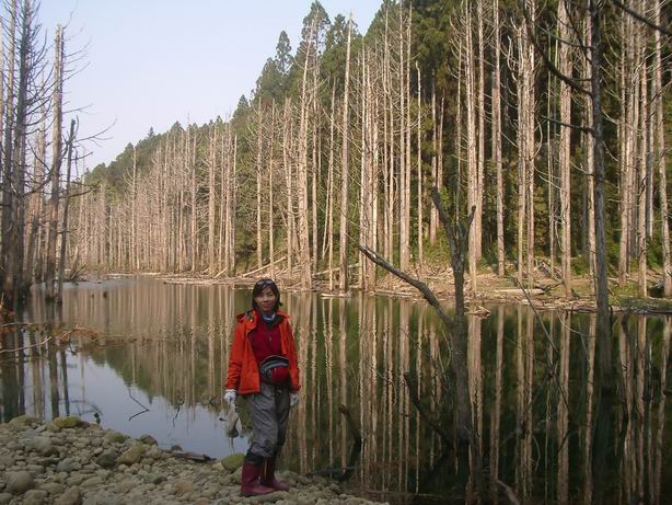 寒假過後,我們利用平常週末走訪溪頭附近名山,第一次訪鳳凰山,第二回走金柑樹山、嶺頭山、貓東望與樟空崙山,剩下四珠之首~鹿屈山還沒造訪;老爸說趁著本週天候不錯,不如來個兩天一夜走訪鹿屈山,然後順到水漾森林紮營,再訪眠月神木,盡遊千人洞,這個提議,全家一致通過,因為這幾個景點久聞其名。聽說水漾森林是一處921大地震所造成的處堰塞湖,面積廣闊,約有200公頃的柳林地遭受水淹,形成一處絕美的白木林沼澤地。看看網路上的照片實在如夢如幻,讓人不禁想要親睹神祕面紗,而且,爬山又可玩水,鐵定好玩得啦!