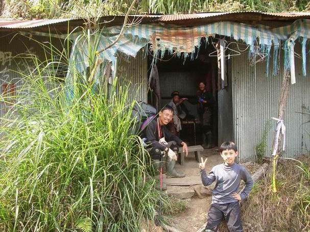 1420經過一個小崩塌後到了鐵皮工寮,有隔間及桌椅,但十分破舊與髒亂,我發現它是直接用杉木蓋起來的,真是太厲害,但上面屋頂破了兩個大洞,妹妹說是開天窗;維常在地上撿到一個墜子,阿姨才發現她的鍊子不見了,大家在附近找找,懸賞找到鍊子的人可以獨享一箱蘋果西打,重賞之下,必有勇小孩,我們都努力地找可是仍不見蹤跡;後來回想可能是在大崩塌處跳躍下降時勾落,可能那要回頭走約15分鐘呀!正在猶豫時,阿姨在衣服內側發現斷裂的鍊子,14:40終於有驚無險地出發。