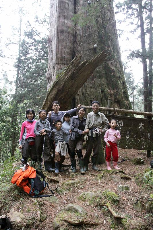 1605 抵達眠月神木,上面還有避雷針的電線以及鐵梯,我們嘗試爬個兩格,然後拍照。海拔約1986公尺。豎牌說神木樹種是紅檜,樹齡約4100年,樹高約48公尺,樹胸圍21.6公尺,真是有夠大的,我們8個人也無法牽手包圍神木,是台灣第三大神木。我到旁邊看看,發現中央部份已腐朽,這大概是日本人放過它的原因吧。