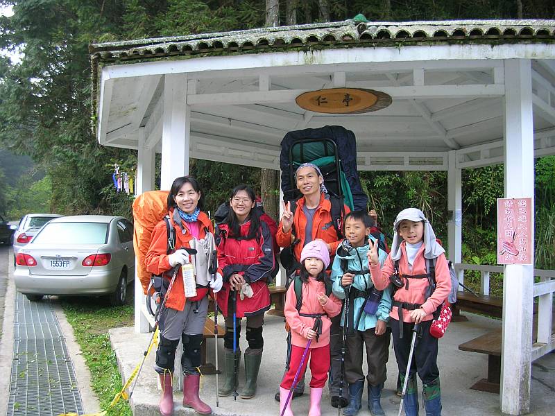 07:08在青年二號橋附近的仁亭停車整裝,剛好遇到一輛中巴開出去,且已停了七、八輛車,今晚一定很熱鬧了;幾分鐘後,遇到兩位來自高雄的山友,認出我們,稍微聊了一下,登山圈子其實不大,而透過網路變得更緊密。開始整裝,兩天的東西與三四天的裝備也差不多,我與妹妹都要背裝備,爸媽的東西當然更多,可是卻忘了帶營燈,野外紮營如果有營燈會更好玩。