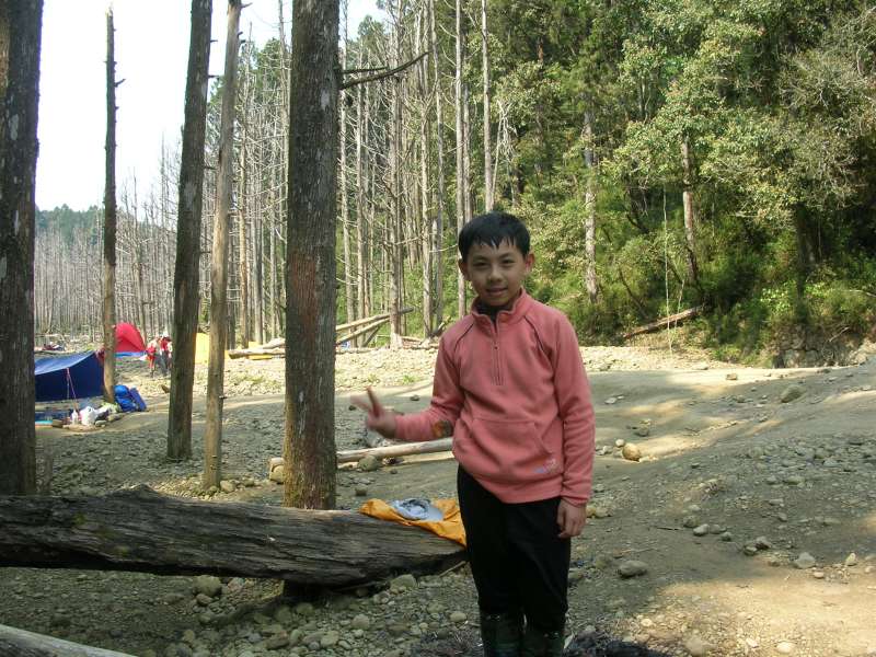 1420一路半走半跳衝到三岔路口,牌子寫著左至入水口哲明營地(上源谷營地),直行出水口與獵寮營地,遇到一個山友正在打電話,告知因為隊友在這裡滑倒而嚴重扭傷,必須申請救援,他叮嚀我們也要小心。我們右下至水漾森林,沿小溪谷而行,的確路陡溼滑,所以小心地走,這下有了山友的眼前教訓,我們小心地走,約8分鐘抵達水漾森林。這時已經有一些山友紮營,我們也熱情地打招呼,馬上賺了「一點」,如果這些山友可以聯成一串更好!走進水漾森林的湖水邊,看到一大片的枯木,筆直挺立水中,和想像中一樣地美,忘憂森林實在無法比擬,先沿水源上方找個平坦營地協助紮營,附近剛好有營火餘燼,整理好帳篷後,爸媽答應讓我們晚上生營火,哇,太棒了!但是要自己尋找足夠的乾柴,爸爸開玩笑說:除了找柴,還要找山羊、水鹿…晚上加菜,妹說要找黑熊…。
