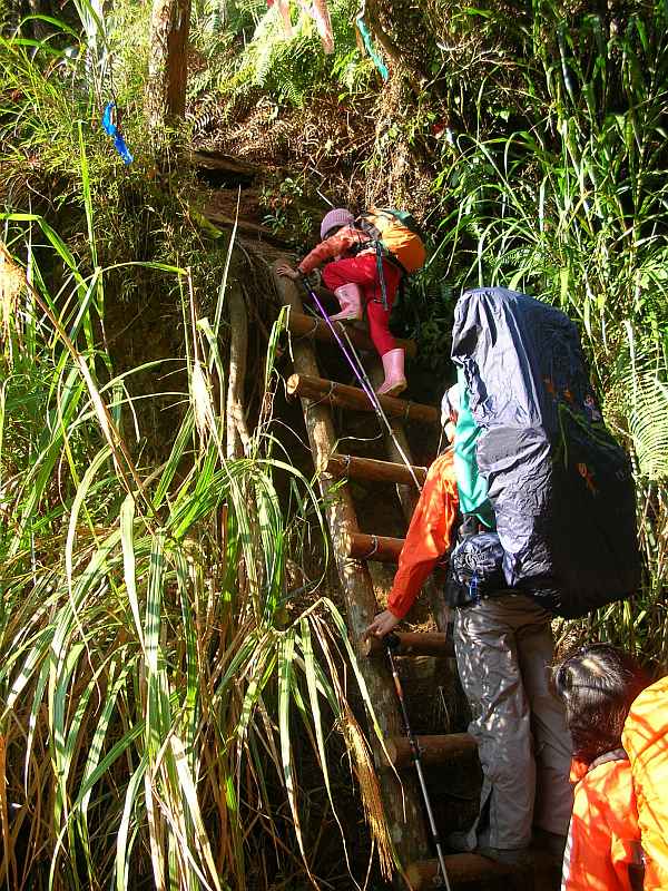 13:30看完直昇機後出發,路還是要走的,因為大約還有4小時的路程。沒多久就先是繩索,後繫鐵鍊陡下林道,右往亞杉坪林道,可到以前溪阿縱走之石猴站,我們取左往杉林溪。海拔約2050公尺。接著在兩旁盡是芒草的小徑前進,每隔一段路就有一個大崩落處,其中一個山壁落差很大,連大人都得拉繩跳躍而下,對於重裝而言其實不輕鬆,叔叔的登山杖還因此弄彎了。