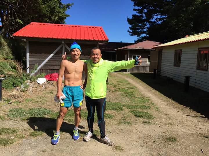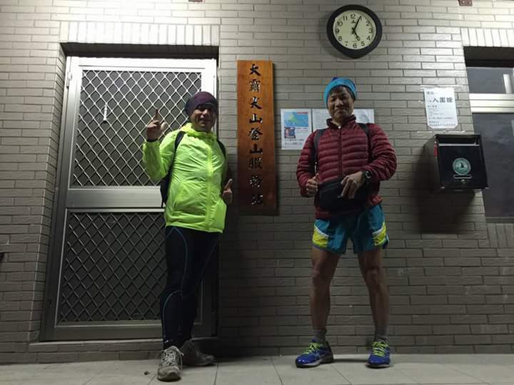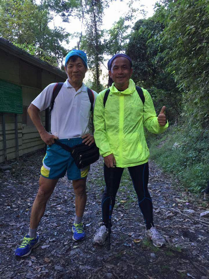 0505~0512 抵0.5 k檢查站,突然大燈亮,兩位盡責工作人員竟然如此早上班,出來檢查入山證明,也請他幫忙拍我倆合照留念:和工作人員道別後以時速約8K慢跑行進