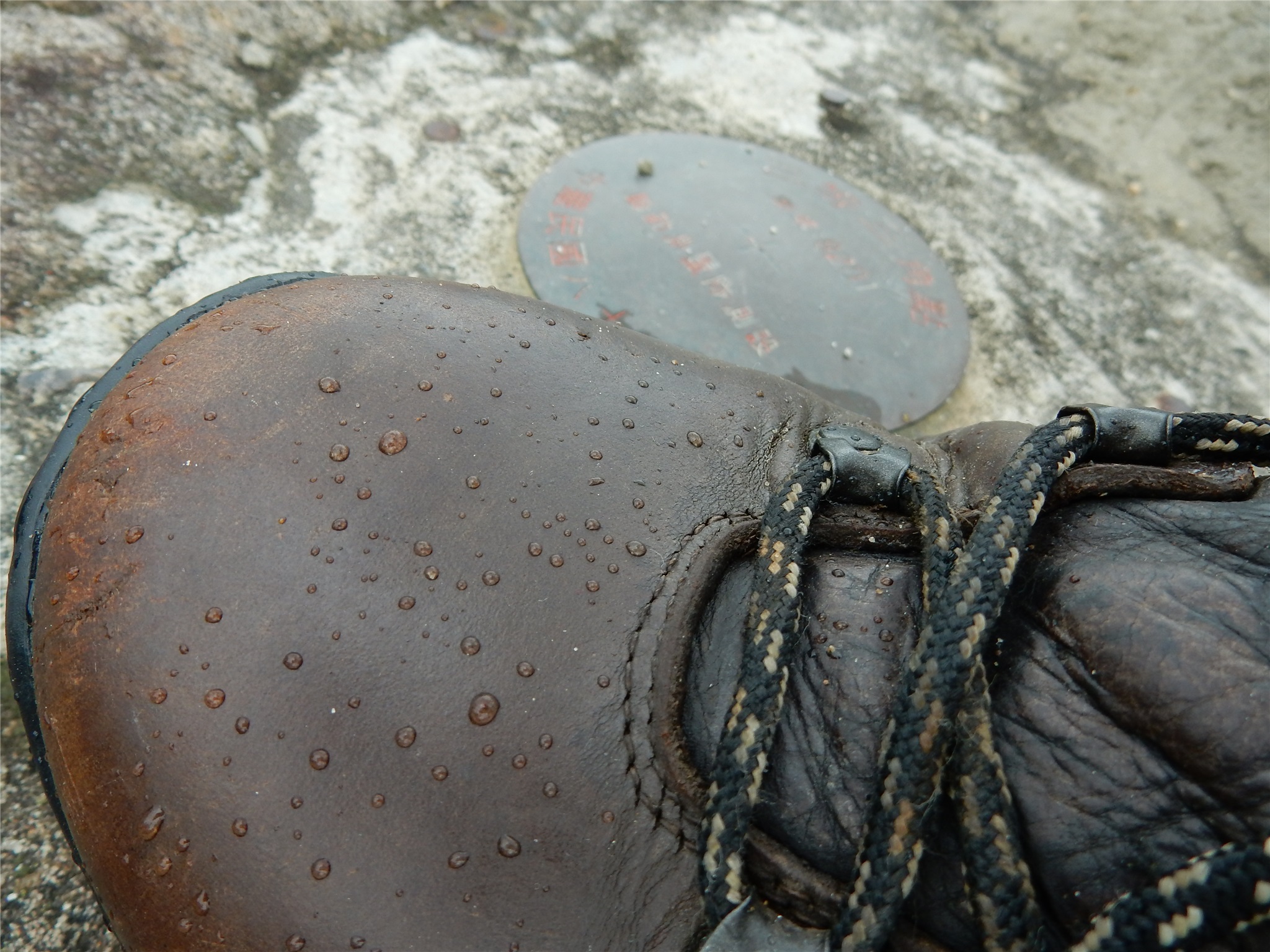 擦了綿羊油做的防水皮革油之後沒遇到下雨,大雨過後爬上唭哩岸山鞋面沾水的情形。