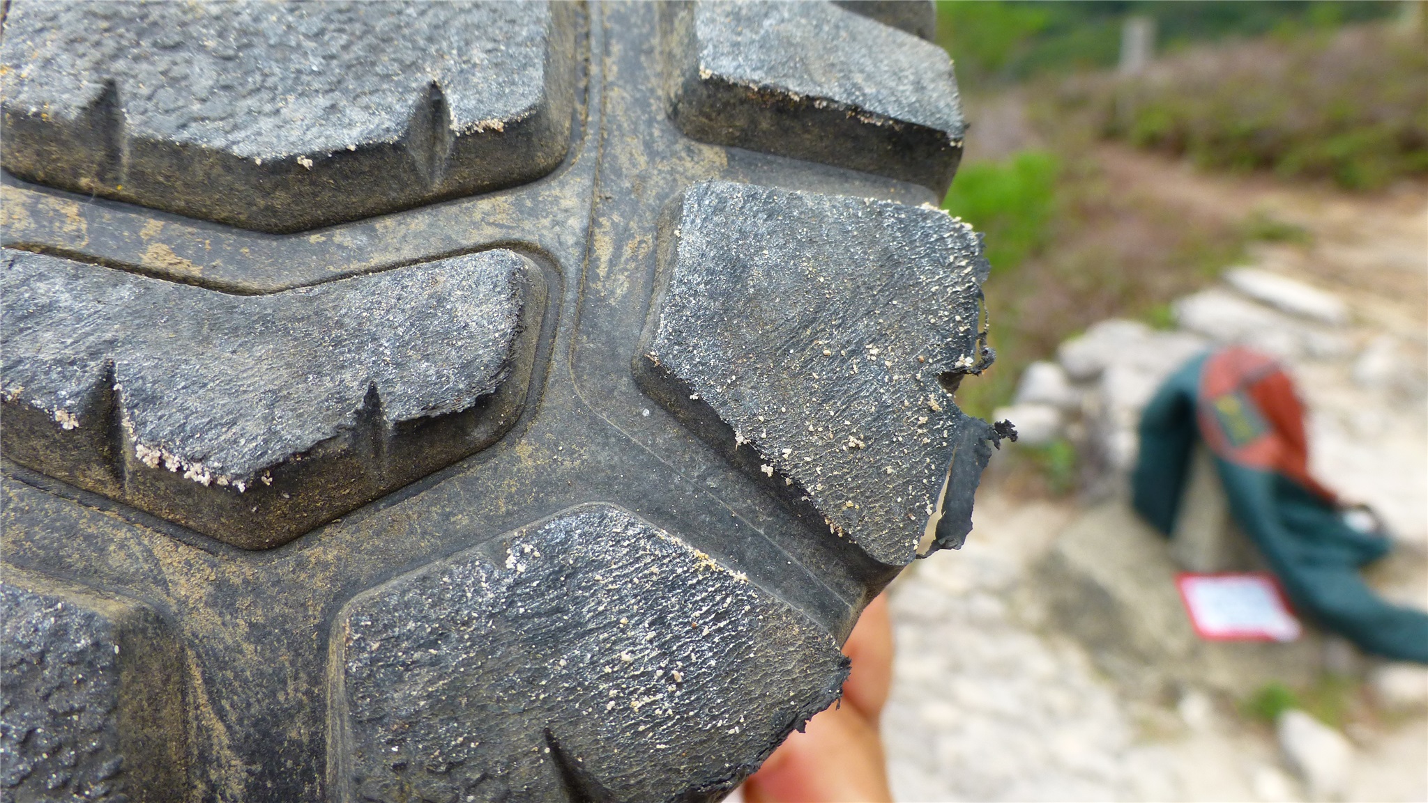 陪我在OSM畫地圖登山路線與現勘的一塊皮換底第一代在這檔高溫期的前一陣雨底部進水,檢查是腳根突起磨掉後破洞地面水跑進去根鞋底鞋根中間內部的那個洞聯通跑到鞋內。
