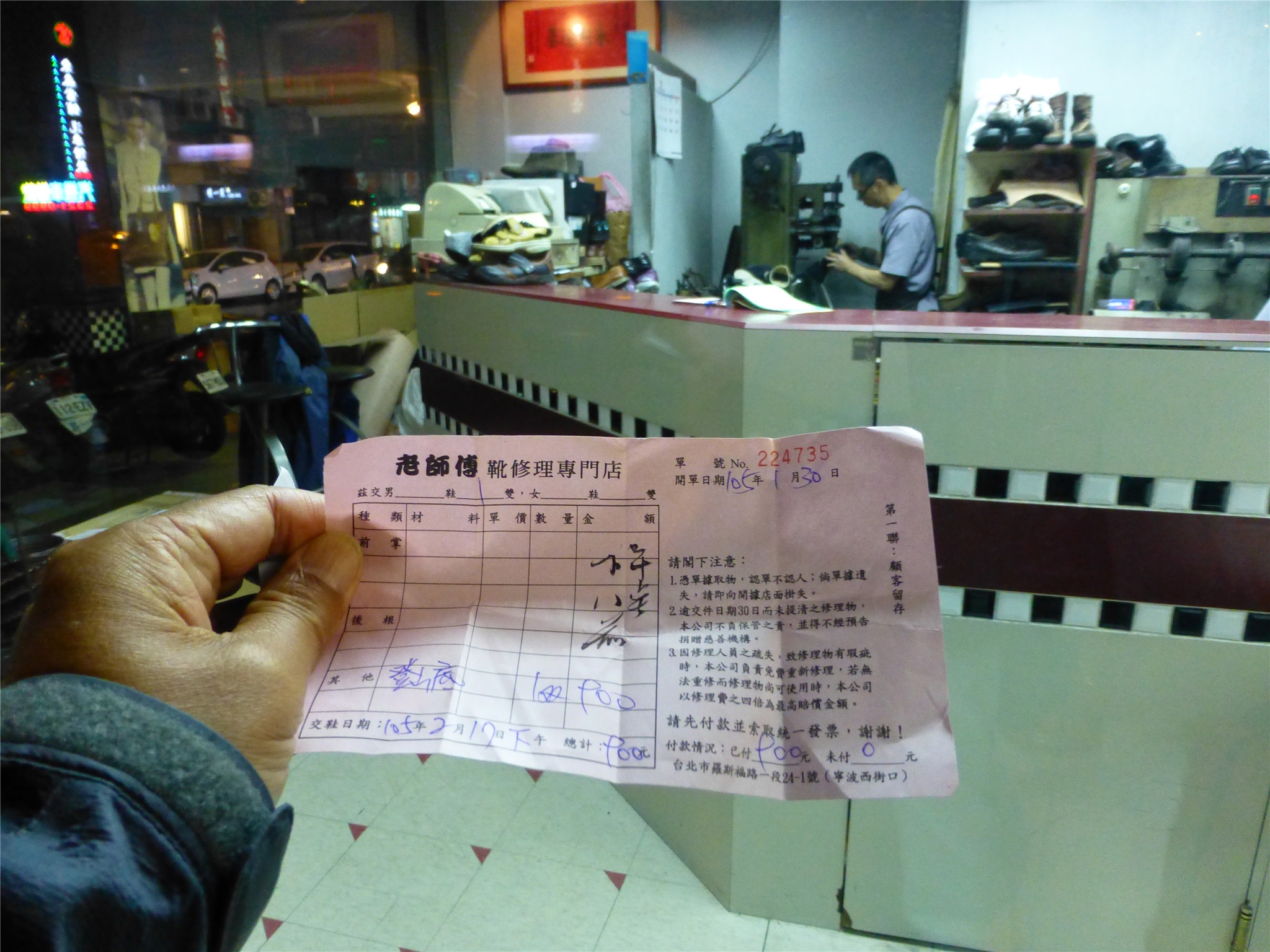 2/17傍晚去,兩位師傅在忙。我給紅色領物單,師傅接走沒多說話從倉庫中拿出修好的鞋,看