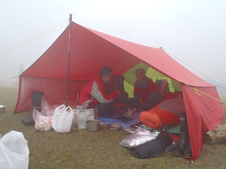 下雨時,很多設計不好的帳棚出入口,都會淋到雨,解決辦法是,出入口加綁一塊約3尺寬的遮雨布。採用防水又輕的降落傘布最理想,一邊使用2~3個夾子(夾文件之大黑夾),夾住帳棚,另一邊可拉繩與使用兩支登山杖等撐住。若遮雨布夠大時,便可直接拉高點,當炊事帳用。