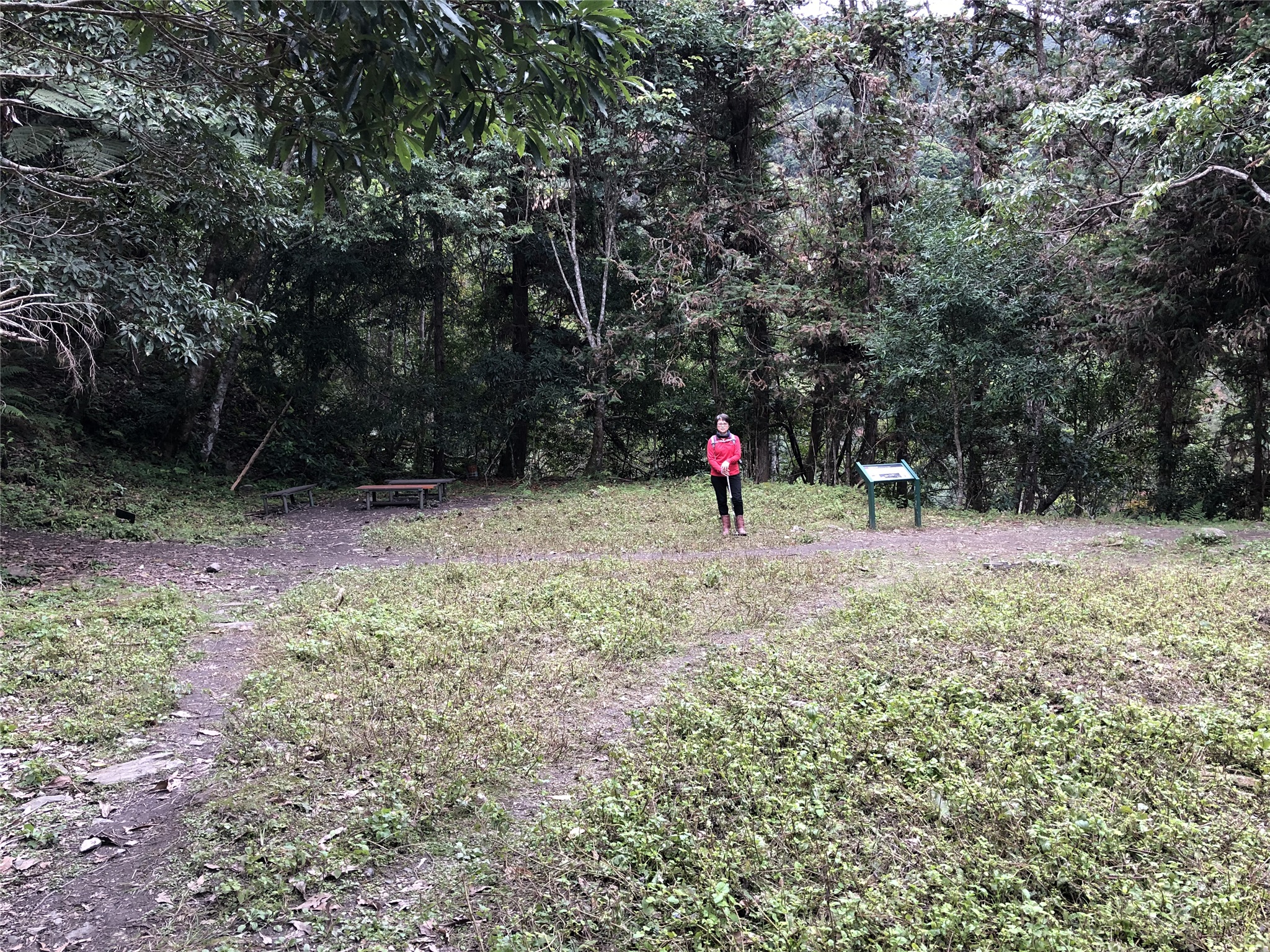 07:27山風駐在所遺址,H510 m,約在步道0.7K處,步道每隔500公尺立有往瓦拉米及步道口的雙向指標;左側有新建平台即是遺址,早年因駐在所西北側寬廣的溪谷,常有強勁的山谷風吹來,故名「山風」,山風駐在所建於1920年,1944年撤廢。
