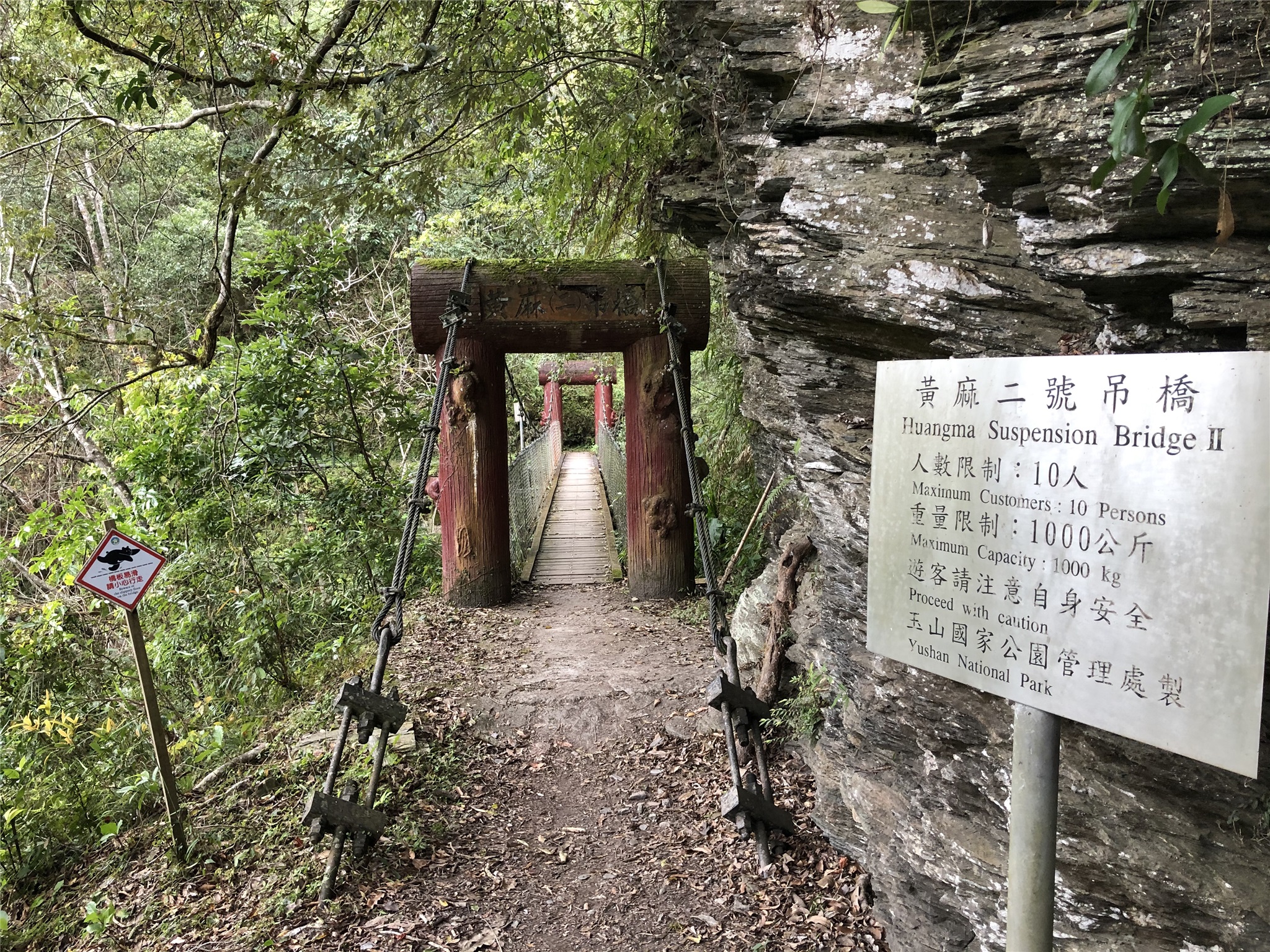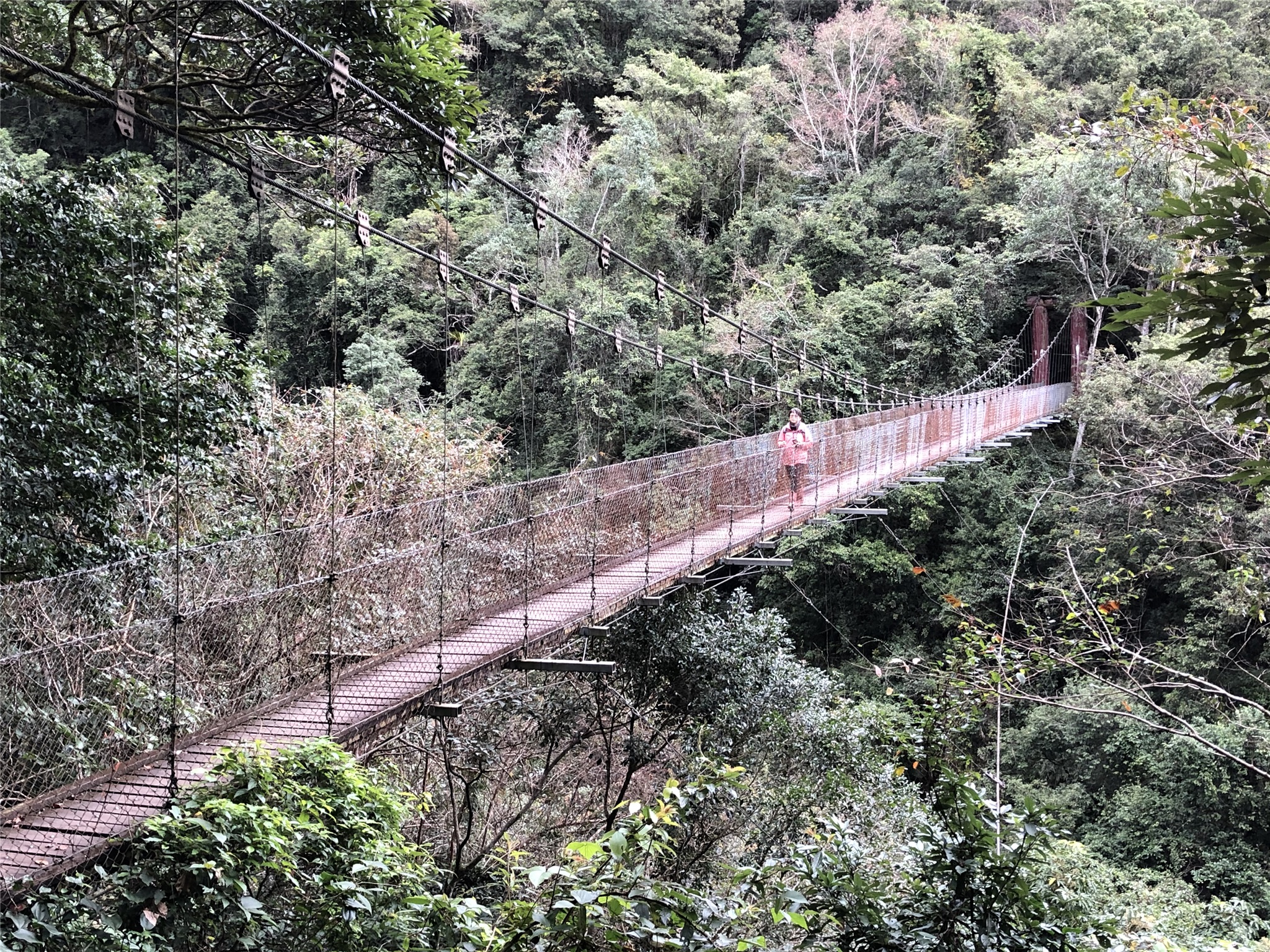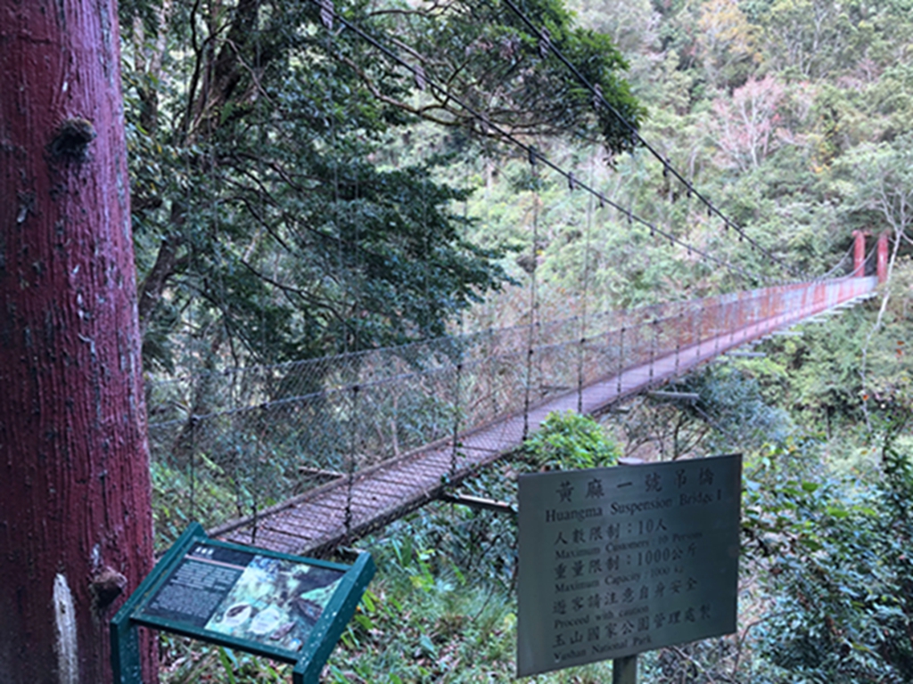 10:52黃麻ㄧ號橋,H876 m,約在步道9.5K處,黃麻ㄧ號橋跨越黃麻溪,紅色的橋門點綴在青山綠水間,格外顯眼;附近植披為終年長青的原始闊葉林,串連成完整的生態體系。