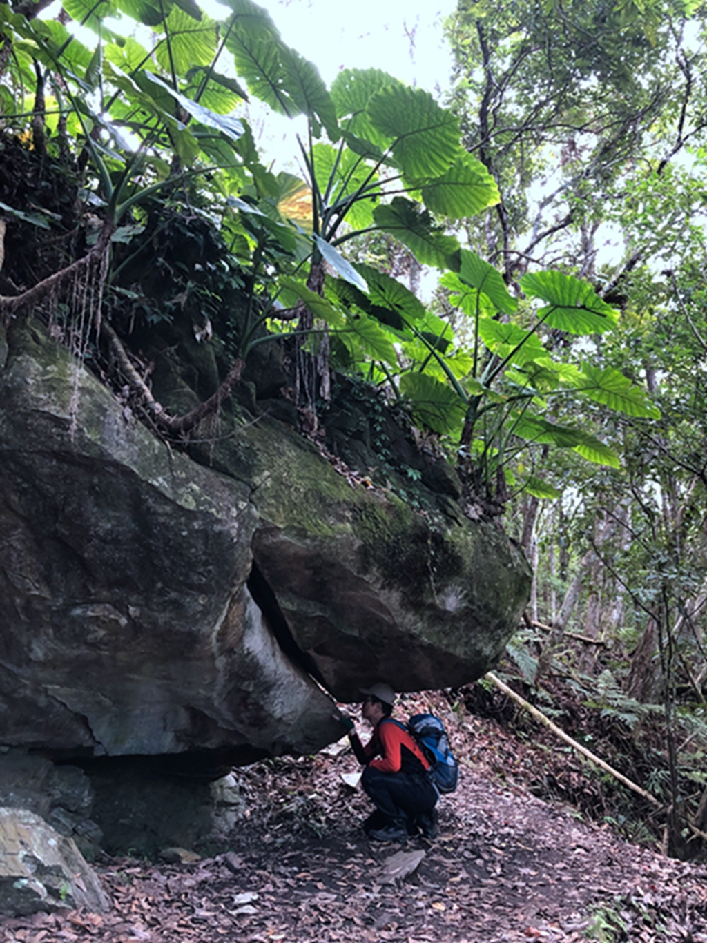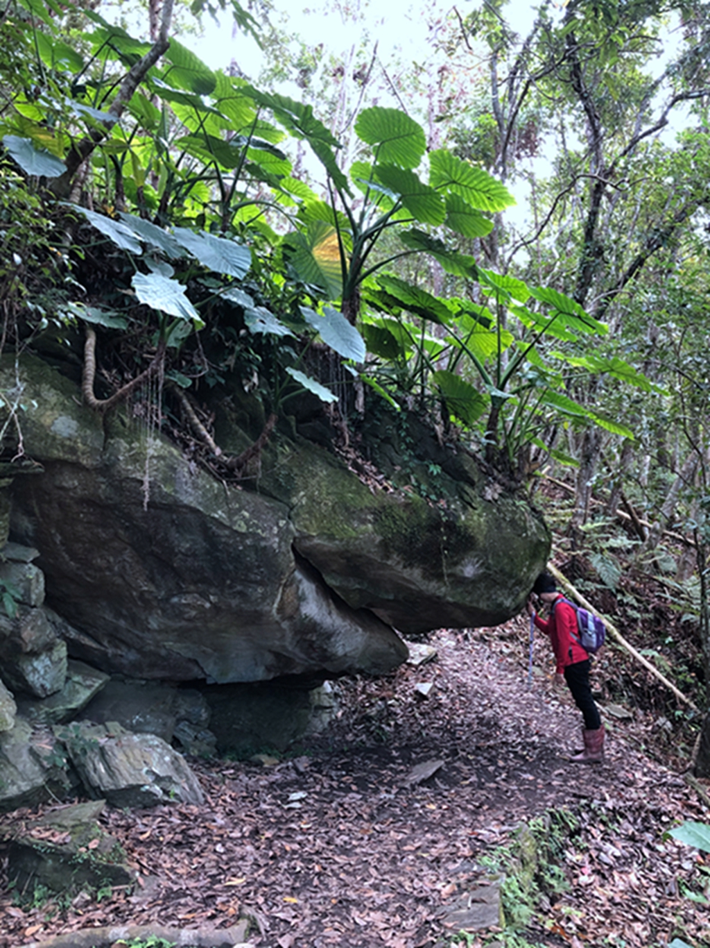 09:52鯊魚頭巨石,長滿姑婆芋的大石頭,正面看像是鯊魚頭,又像青蛙蹲姿,造型逗趣,樹上寄生的蕨類非常豐富,愛玉子蔓藤附生在樹上,樹有多高它就長多高,猴子採摘吃剩的愛玉果丟在地上,才輪到我們撿來把玩。