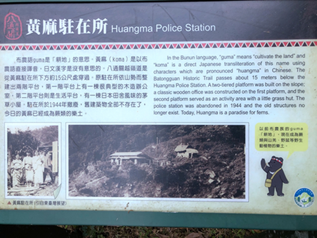 10:25黃麻駐在所,H925 m,約在步道7.9K處,立有解說牌及四排座椅,布農語koma是「耕地」之意,原駐在所依山勢而整建,也於1944年撤廢,舊建築物現已全部不存在了,僅剩一個空曠的廣場,今日的黃麻已經成為蕨類遍佈,及山羌、猴子等野生動物的樂園。